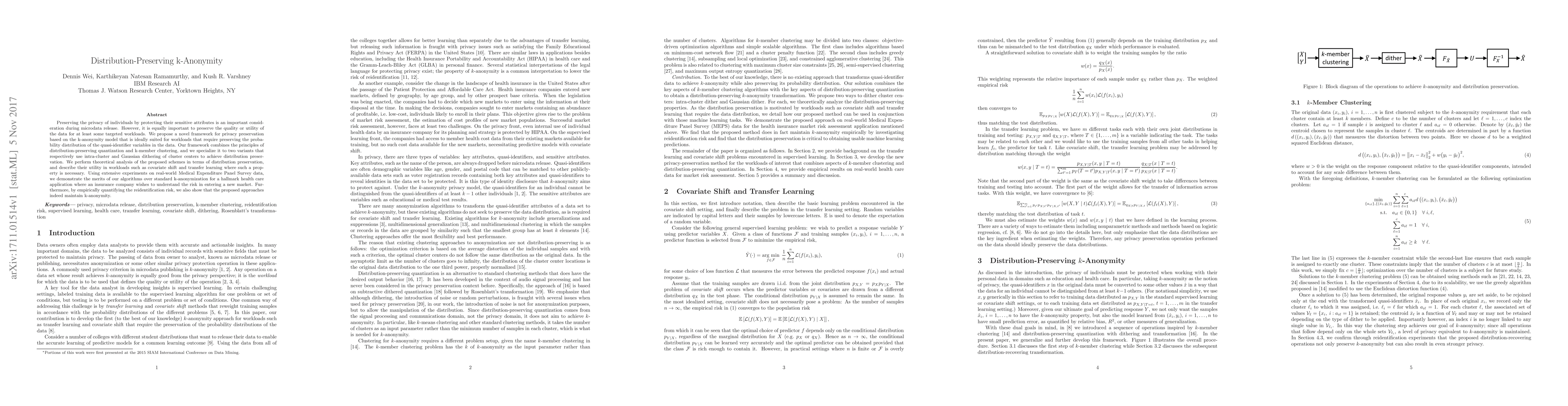 Preserving the privacy of individuals by protecting their sensitive attributes is an important consideration during microdata release. However, it is equally important to preserve the quality or utility of the data for at least some targeted workloads. We propose a novel framework for privacy preservation based on the k-anonymity model that is ideally suited for workloads that require preserving the probability distribution of the quasi-identifier variables in the data. Our framework combines the principles of distribution-preserving quantization and k-member clustering, and we specialize it to two variants that respectively use intra-cluster and Gaussian dithering of cluster centers to achieve distribution preservation. We perform theoretical analysis of the proposed schemes in terms of distribution preservation, and describe their utility in workloads such as covariate shift and transfer learning where such a property is necessary. Using extensive experiments on real-world Medical Expenditure Panel Survey data, we demonstrate the merits of our algorithms over standard k-anonymization for a hallmark health care application where an insurance company wishes to understand the risk in entering a new market. Furthermore, by empirically quantifying the reidentification risk, we also show that the proposed approaches indeed maintain k-anonymity.