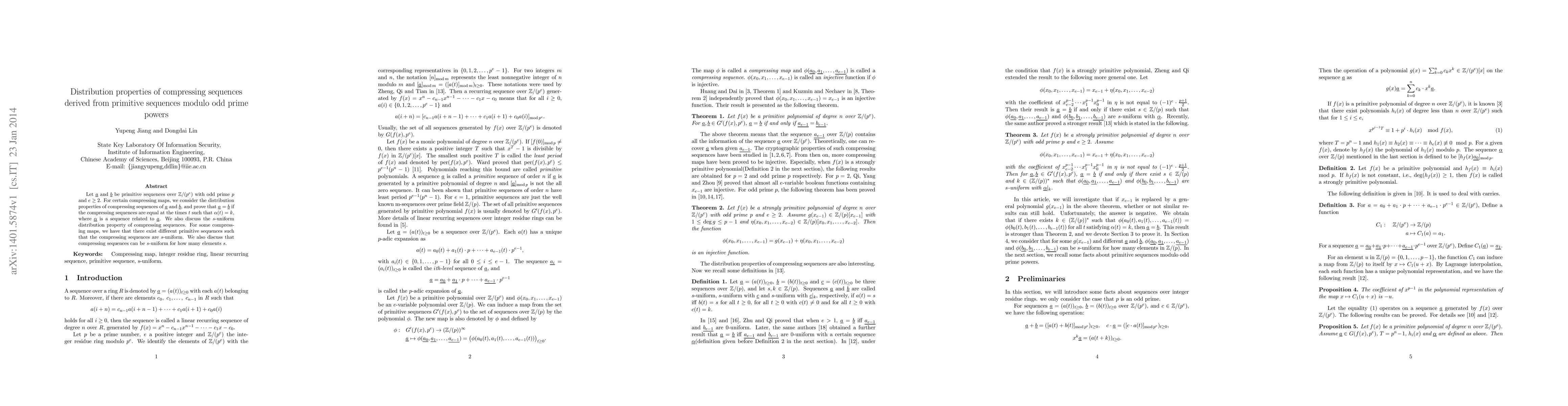 This paper explores the distribution properties of compressing sequences derived from primitive sequences modulo odd prime powers, proving that equal compressing sequences imply identical primitive sequences under specific conditions. It also investigates the $s$-uniform distribution property, showing that different primitive sequences can yield compressing sequences that are uniformly distributed for certain values of $s$.