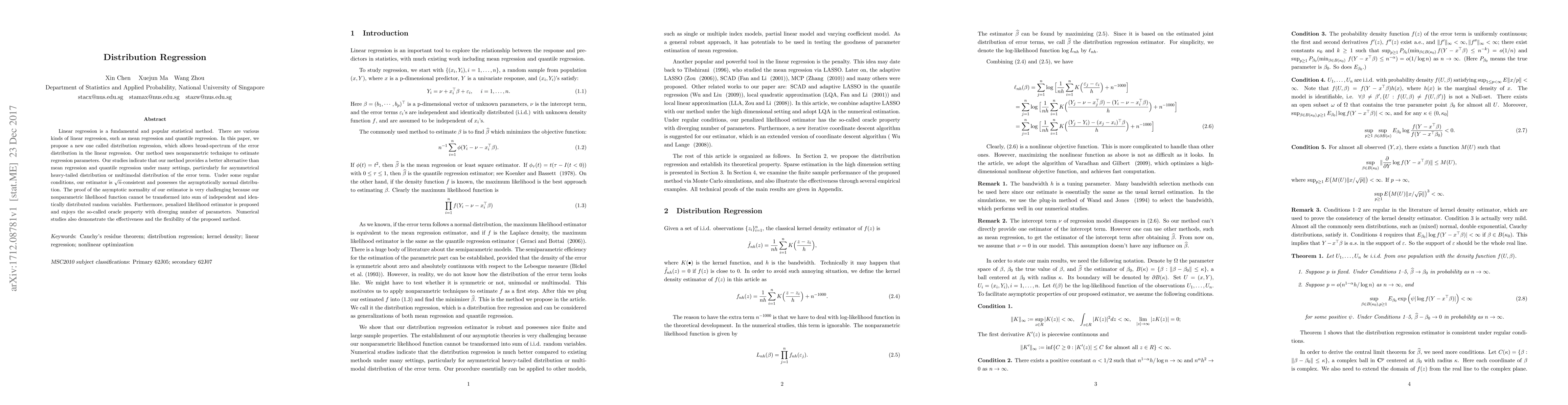 This paper introduces distribution regression, a novel nonparametric method for linear regression that accommodates a broad range of error distributions, outperforming mean and quantile regressions especially for asymmetrical and multimodal error distributions. The method is shown to be $\sqrt n$-consistent and asymptotically normal under certain conditions.