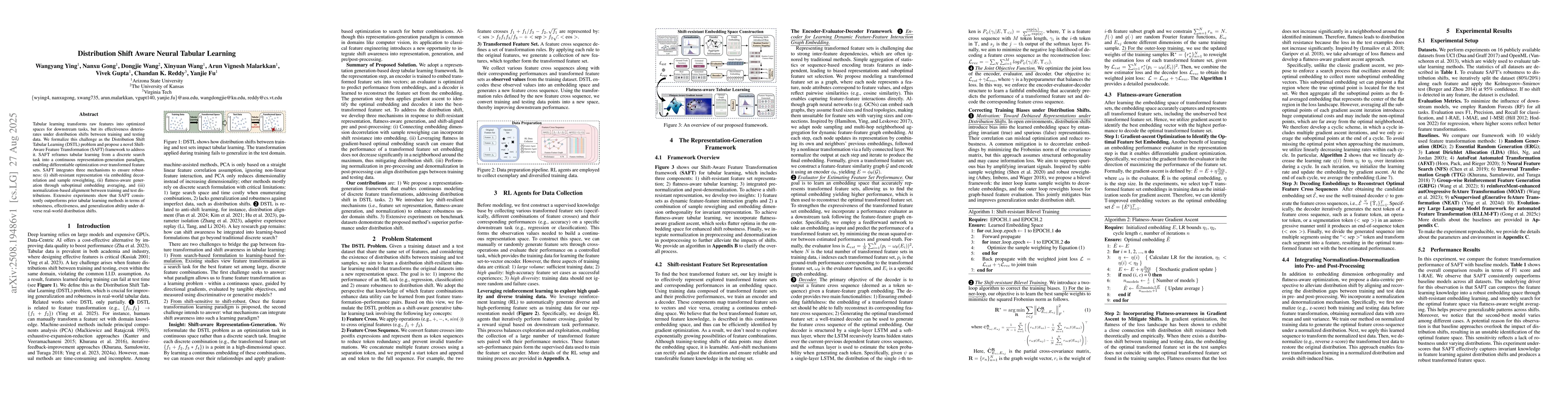 Tabular learning transforms raw features into optimized spaces for downstream tasks, but its effectiveness deteriorates under distribution shifts between training and testing data. We formalize this challenge as the Distribution Shift Tabular Learning (DSTL) problem and propose a novel Shift-Aware Feature Transformation (SAFT) framework to address it. SAFT reframes tabular learning from a discrete search task into a continuous representation-generation paradigm, enabling differentiable optimization over transformed feature sets. SAFT integrates three mechanisms to ensure robustness: (i) shift-resistant representation via embedding decorrelation and sample reweighting, (ii) flatness-aware generation through suboptimal embedding averaging, and (iii) normalization-based alignment between training and test distributions. Extensive experiments show that SAFT consistently outperforms prior tabular learning methods in terms of robustness, effectiveness, and generalization ability under diverse real-world distribution shifts.