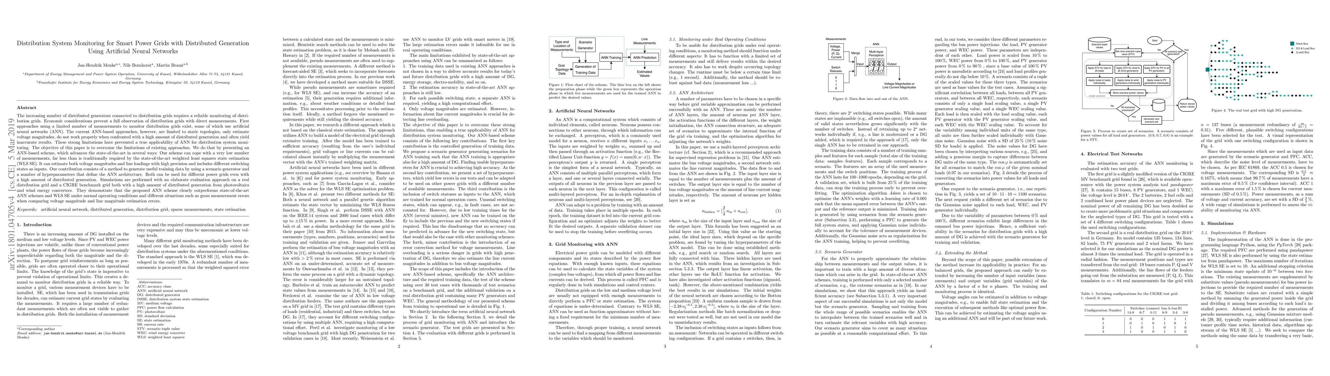 This paper proposes an advanced artificial neural network (ANN)-based scheme for monitoring smart power grids with distributed generation, addressing limitations of existing methods. The new scheme estimates voltage magnitudes and line loadings with high precision using fewer measurements than traditional methods, and it performs well even with a high amount of distributed generation.