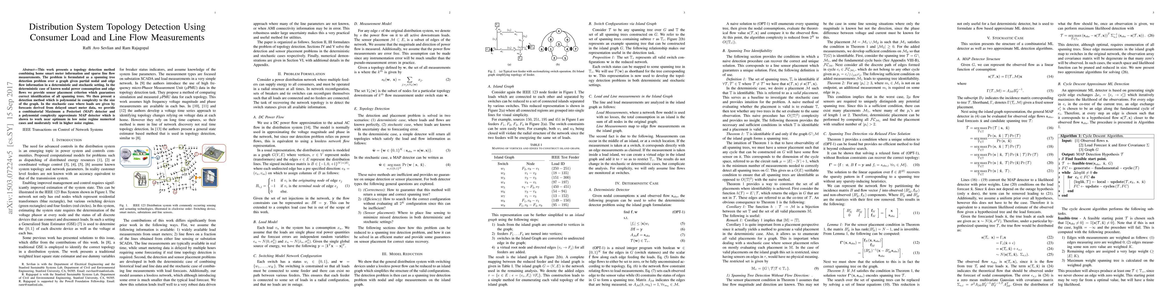 A new method detects distribution system topology using consumer load data and line flow measurements, with a focus on efficient sensor placement and robust detection in noisy conditions.