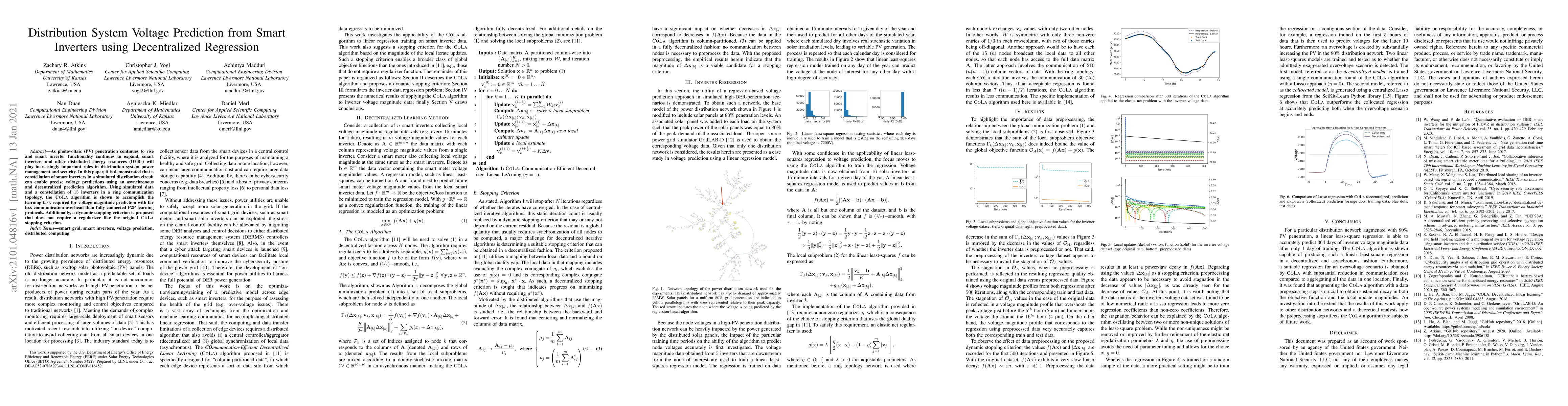 This paper demonstrates that a decentralized regression algorithm using smart inverters can accurately predict voltage in distribution systems, achieving precise voltage magnitude predictions with minimal communication overhead compared to fully connected protocols. The proposed COLA algorithm and a dynamic stopping criterion enhance the efficiency and effectiveness of voltage prediction.