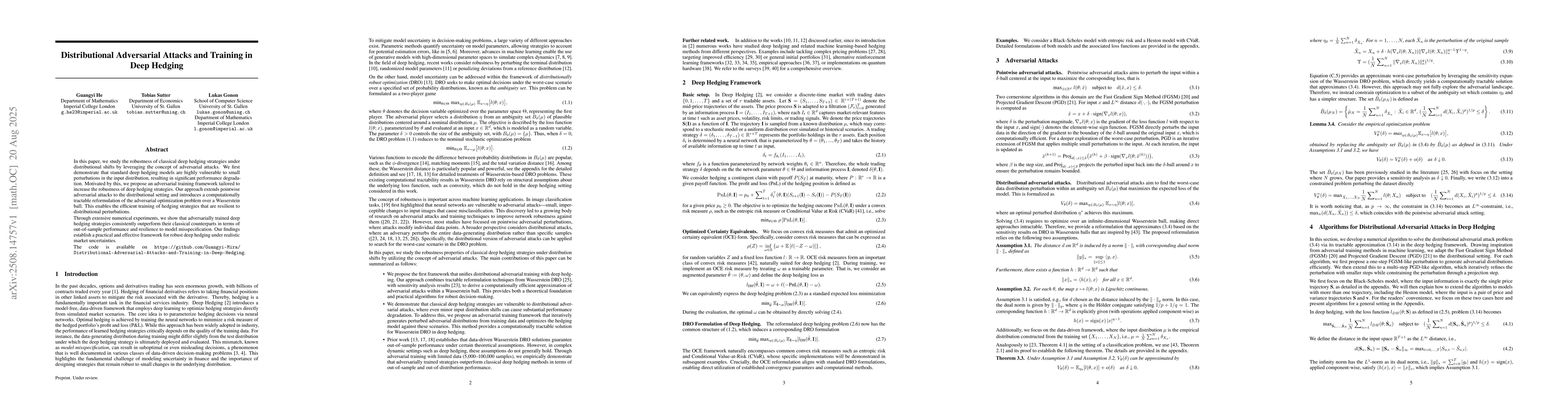 This research proposes an adversarial training framework for deep hedging strategies, extending pointwise adversarial attacks to the distributional setting and introducing a computationally tractable reformulation of the adversarial optimization problem over a Wasserstein ball.