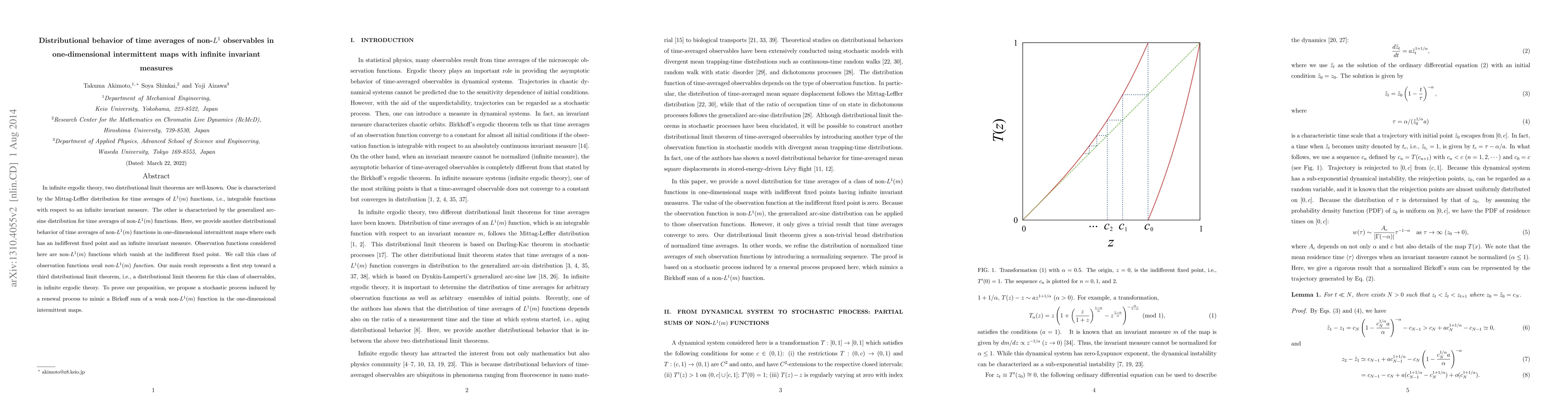 In infinite ergodic theory, two distributional limit theorems are well-known. One is characterized by the Mittag-Leffler distribution for time averages of $L^1(m)$ functions, i.e., integrable functions with respect to an infinite invariant measure. The other is characterized by the generalized arc-sine distribution for time averages of non-$L^1(m)$ functions. Here, we provide another distributional behavior of time averages of non-$L^1(m)$ functions in one-dimensional intermittent maps where each has an indifferent fixed point and an infinite invariant measure. Observation functions considered here are non-$L^1(m)$ functions which vanish at the indifferent fixed point. We call this class of observation functions weak non-$L^1(m)$ function. Our main result represents a first step toward a third distributional limit theorem, i.e., a distributional limit theorem for this class of observables, in infinite ergodic theory. To prove our proposition, we propose a stochastic process induced by a renewal process to mimic a Birkoff sum of a weak non-$L^1(m)$ function in the one-dimensional intermittent maps.