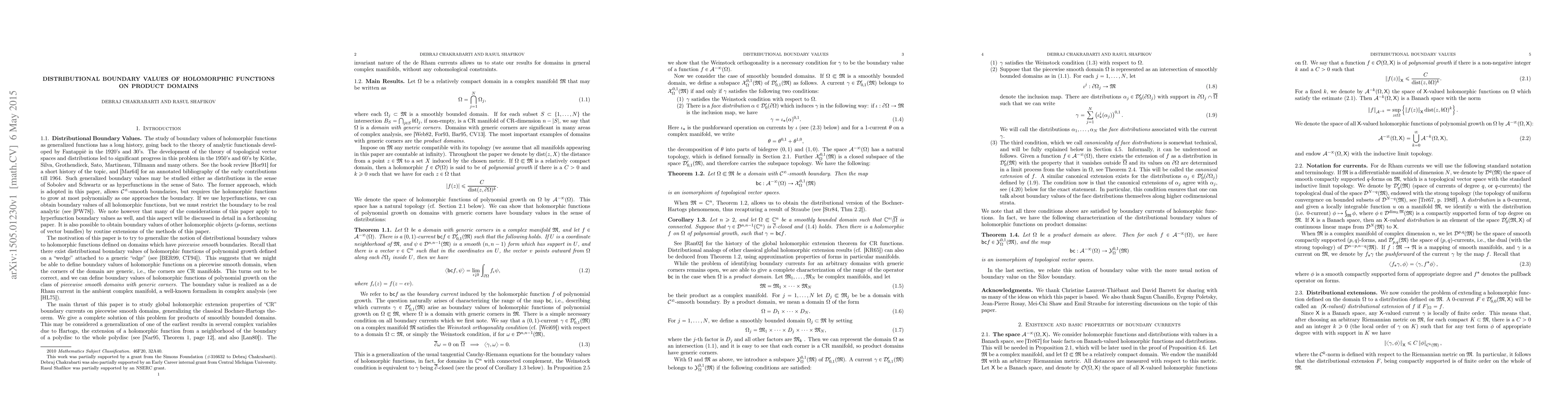 We show that holomorphic functions of polynomial growth on domains with corners have distributional boundary values in an appropriate sense, provided the corners are generic CR manifolds. We prove an analog of the Bochner-Hartogs theorem for these boundary values for the simplest such domains, the product domains.