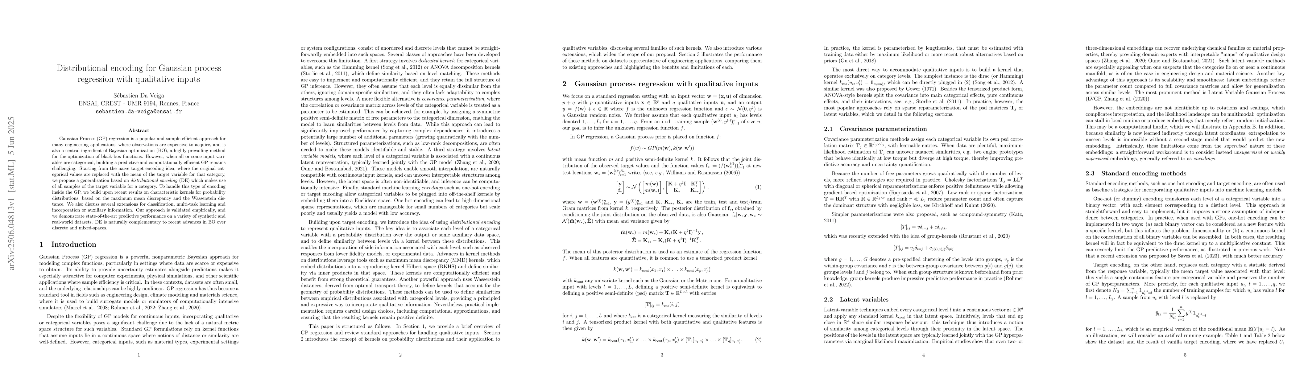 The research proposes distributional encoding (DE) for Gaussian Process (GP) regression with qualitative inputs, utilizing all target variable samples for a category via characteristic kernels based on maximum mean discrepancy and Wasserstein distance.