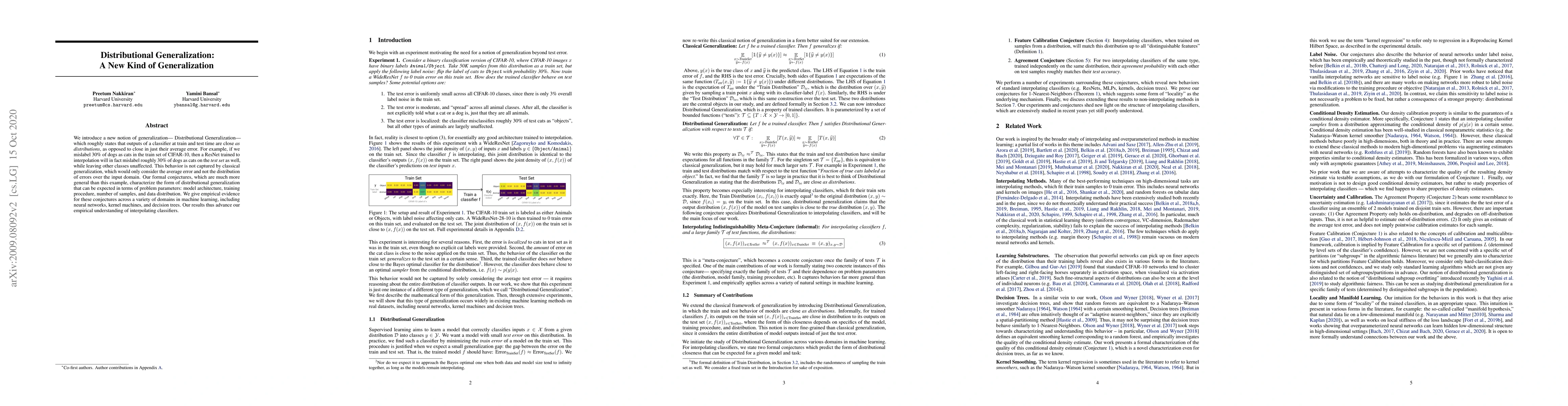 This paper introduces "Distributional Generalization," a novel concept where a classifier's outputs at train and test time are similar as distributions, not just in average error. It provides empirical evidence across various machine learning models, suggesting that this form of generalization can be influenced by model architecture, training procedure, sample size, and data distribution.