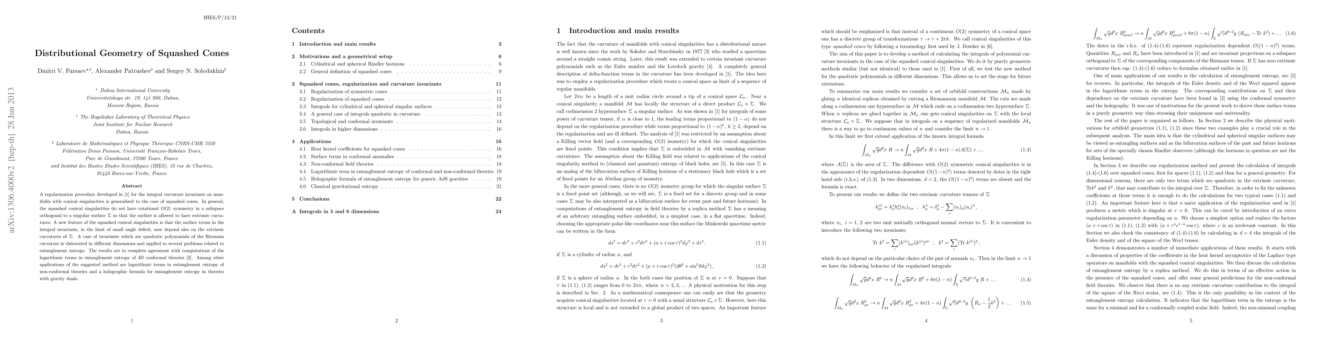 A regularization procedure developed in [1] for the integral curvature invariants on manifolds with conical singularities is generalized to the case of squashed cones. In general, the squashed conical singularities do not have rotational O(2) symmetry in a subspace orthogonal to a singular surface $\Sigma$ so that the surface is allowed to have extrinsic curvatures. A new feature of the squashed conical singularities is that the surface terms in the integral invariants, in the limit of small angle deficit, now depend also on the extrinsic curvatures of $\Sigma$. A case of invariants which are quadratic polynomials of the Riemann curvature is elaborated in different dimensions and applied to several problems related to entanglement entropy. The results are in complete agreement with computations of the logarithmic terms in entanglement entropy of 4D conformal theories [2]. Among other applications of the suggested method are logarithmic terms in entanglement entropy of non-conformal theories and a holographic formula for entanglement entropy in theories with gravity duals.