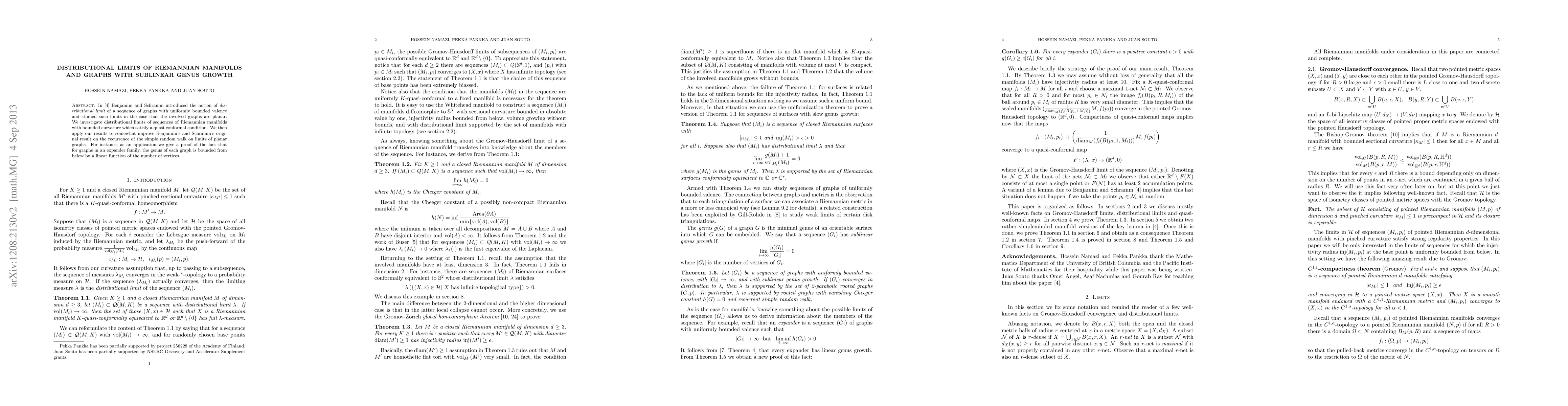 This paper explores the distributional limits of Riemannian manifolds with bounded curvature and quasi-conformal conditions, extending Benjamini and Schramm's work on planar graphs. It improves results on the recurrence of simple random walks and proves that the genus of expander graphs is bounded below by a linear function of the number of vertices.