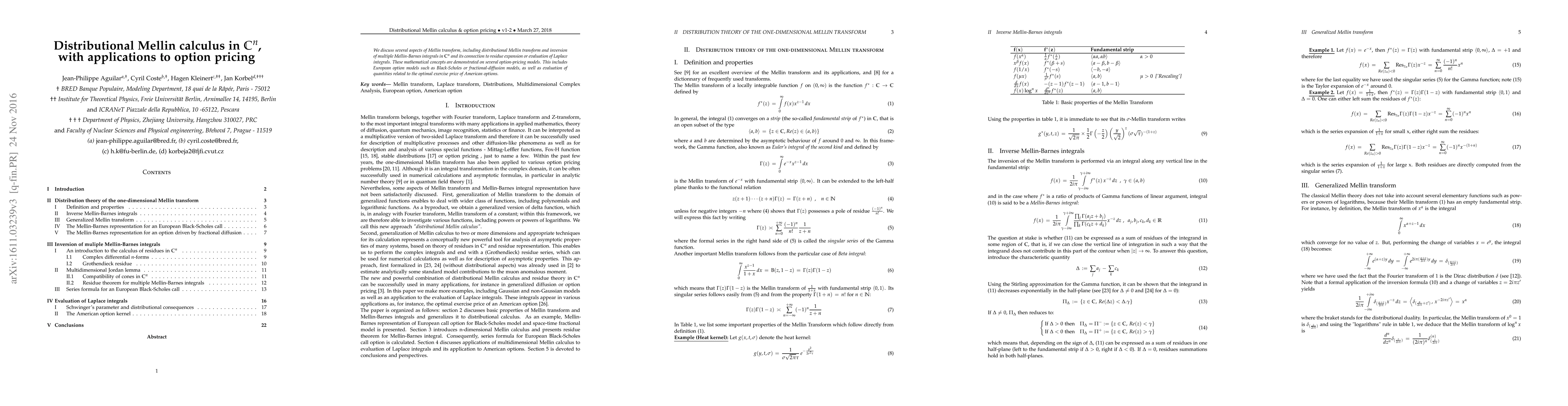 This paper explores the distributional Mellin calculus in $\mathbb{C}^n$ and its application to option pricing, focusing on the inversion of multiple Mellin-Barnes integrals and their connection to residue expansions. It demonstrates these concepts in various option-pricing models, including Black-Scholes and fractional-diffusion models, and evaluates quantities related to American options.