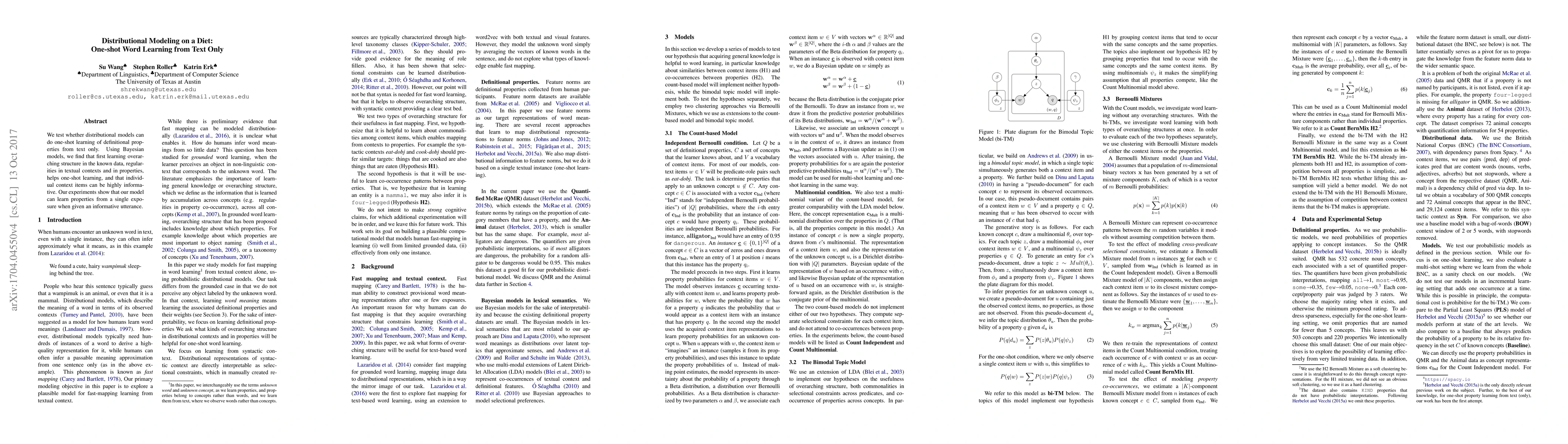 This research demonstrates that distributional models can perform one-shot learning of word properties from text alone. Utilizing Bayesian models, the study finds that understanding the overarching text structure and property regularities aids single-exposure learning, proving the model's effectiveness with informative utterances.
