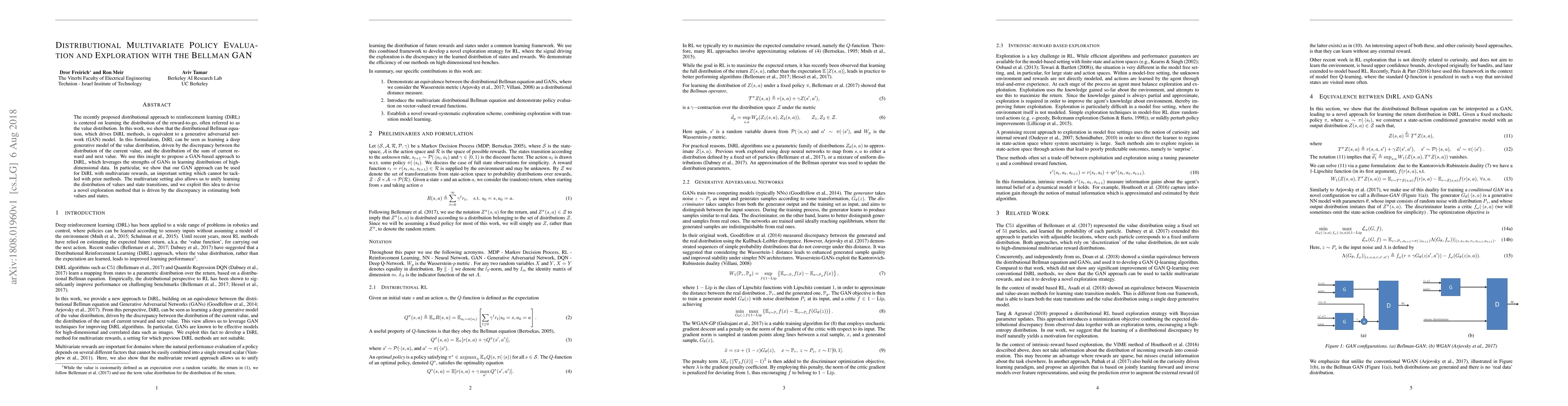 The recently proposed distributional approach to reinforcement learning (DiRL) is centered on learning the distribution of the reward-to-go, often referred to as the value distribution. In this work, we show that the distributional Bellman equation, which drives DiRL methods, is equivalent to a generative adversarial network (GAN) model. In this formulation, DiRL can be seen as learning a deep generative model of the value distribution, driven by the discrepancy between the distribution of the current value, and the distribution of the sum of current reward and next value. We use this insight to propose a GAN-based approach to DiRL, which leverages the strengths of GANs in learning distributions of high-dimensional data. In particular, we show that our GAN approach can be used for DiRL with multivariate rewards, an important setting which cannot be tackled with prior methods. The multivariate setting also allows us to unify learning the distribution of values and state transitions, and we exploit this idea to devise a novel exploration method that is driven by the discrepancy in estimating both values and states.
