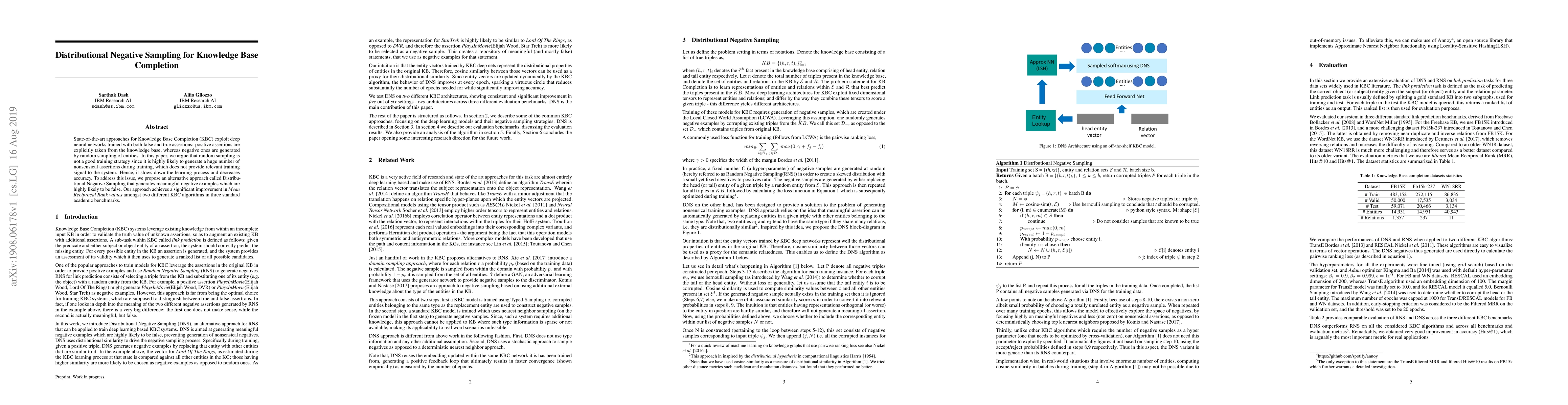 A new method for training knowledge base completion models called Distributional Negative Sampling generates meaningful false assertions to improve learning speed and accuracy. It outperforms existing methods in three academic benchmarks.