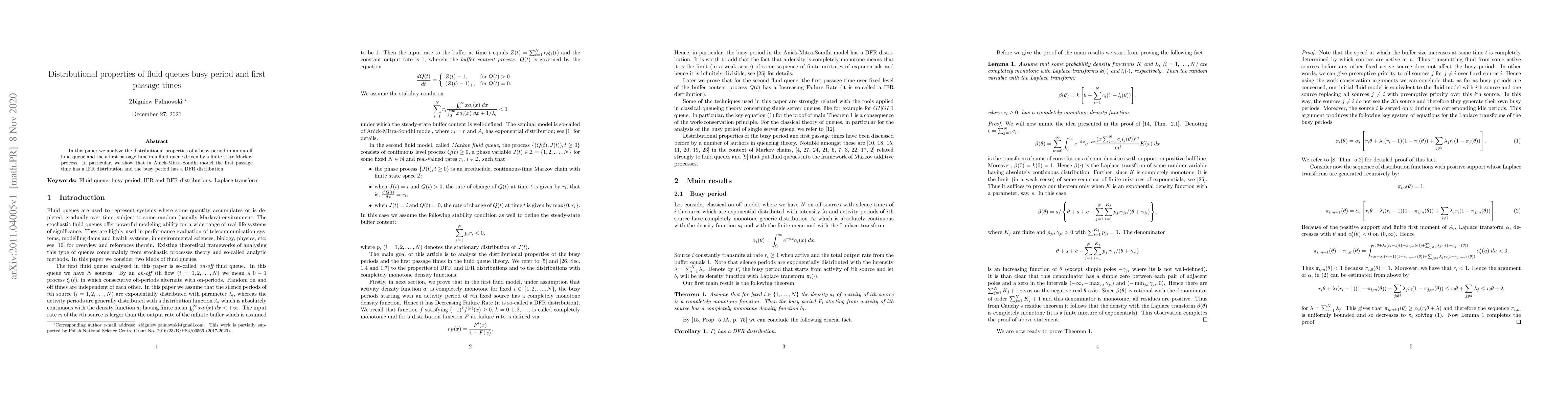 In this paper we analyze the distributional properties of a busy period in an on-off fluid queue and the a first passage time in a fluid queue driven by a finite state Markov process. In particular, we show that in Anick-Mitra-Sondhi model the first passage time has a IFR distribution and the busy period has a DFR distribution.