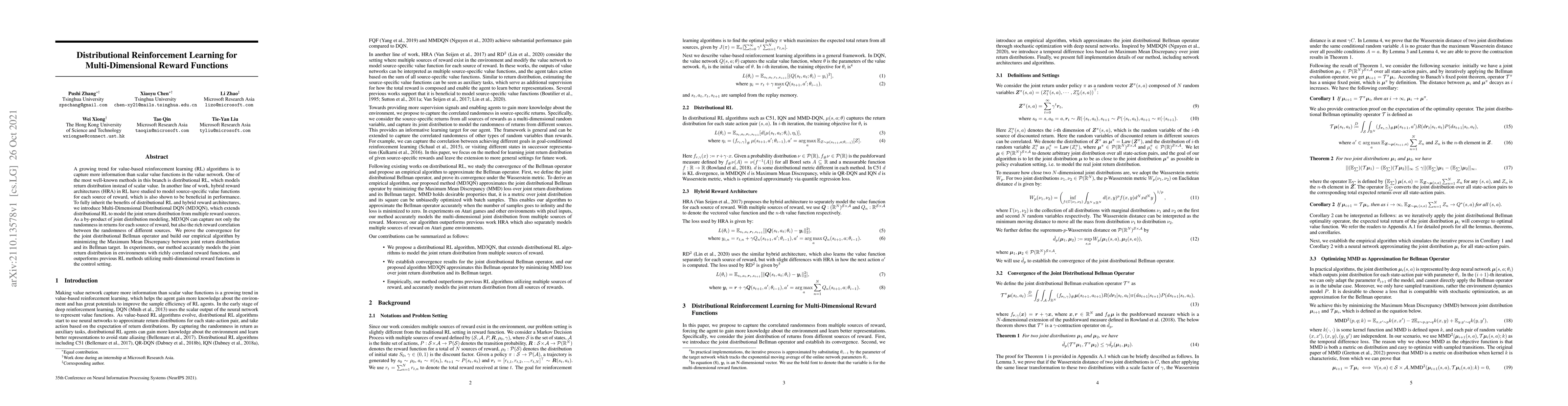 This paper introduces Multi-Dimensional Distributional DQN (MD3QN), a reinforcement learning method that combines distributional RL and hybrid reward architectures to model joint return distributions from multiple reward sources. The method outperforms previous approaches in environments with correlated multi-dimensional rewards.