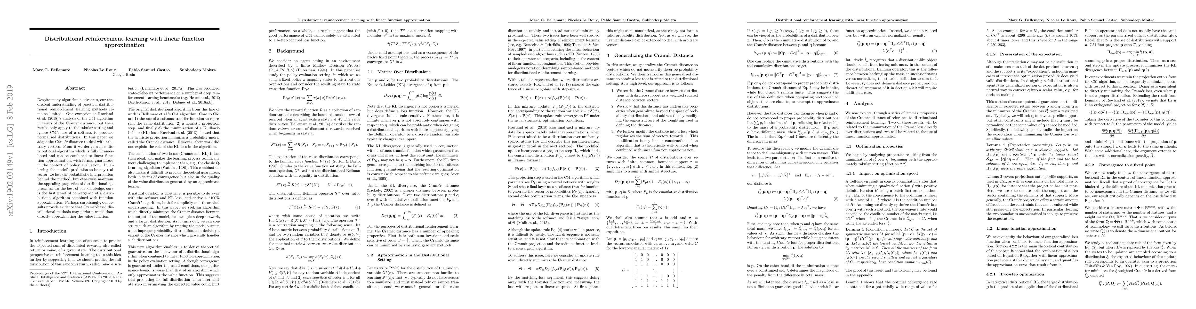 This paper introduces a new distributional reinforcement learning algorithm based on the Cramér distance, which can incorporate linear function approximation, providing formal convergence guarantees. Despite losing the probabilistic interpretation, the method retains the benefits of distributional approaches, though it suggests Cramér-based methods may underperform value function approximation directly.