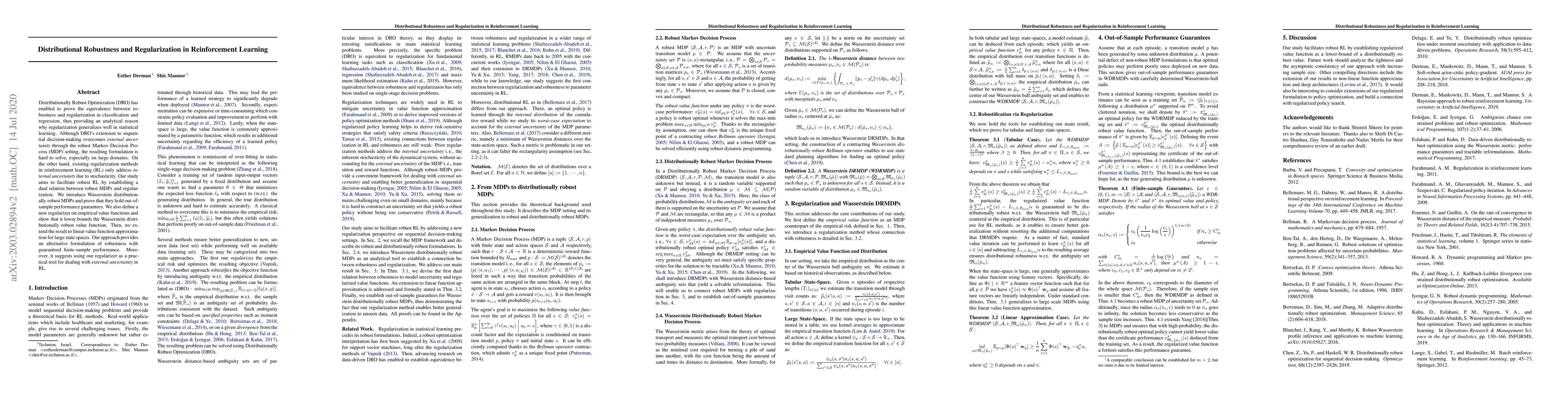 This paper explores the connection between distributionally robust optimization and regularization in reinforcement learning, introducing Wasserstein distributionally robust Markov Decision Processes. It establishes a dual relation between robust MDPs and regularization, providing out-of-sample performance guarantees and suggesting regularization as a practical method for addressing external uncertainty in RL.