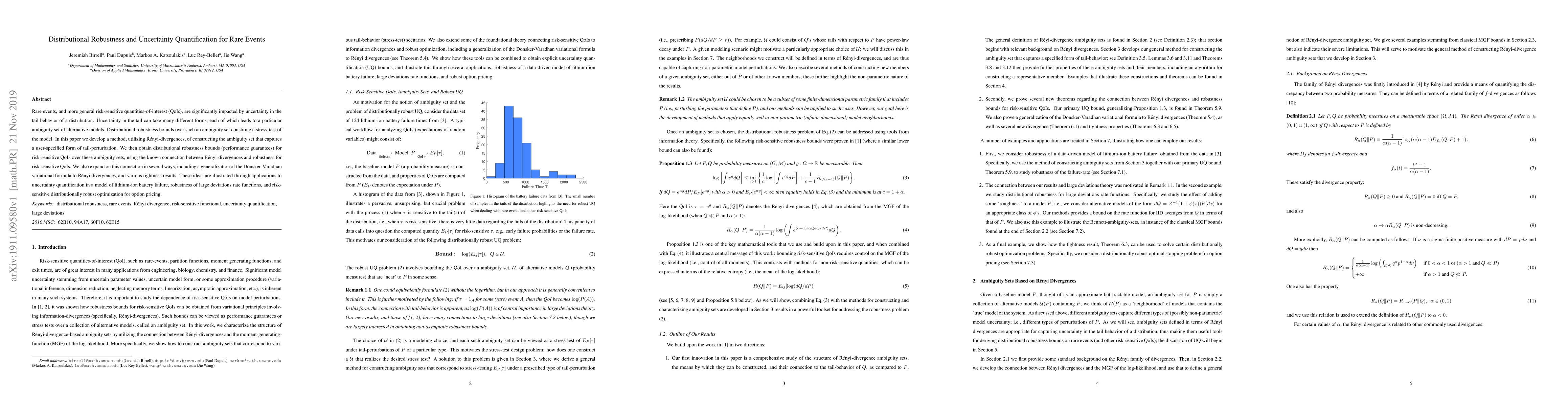 This paper develops a method using Rényi-divergences to construct ambiguity sets for distributional robustness, focusing on tail-perturbation and risk-sensitive quantities. It provides distributional robustness bounds for rare events and illustrates applications in battery failure modeling, large deviations, and option pricing.