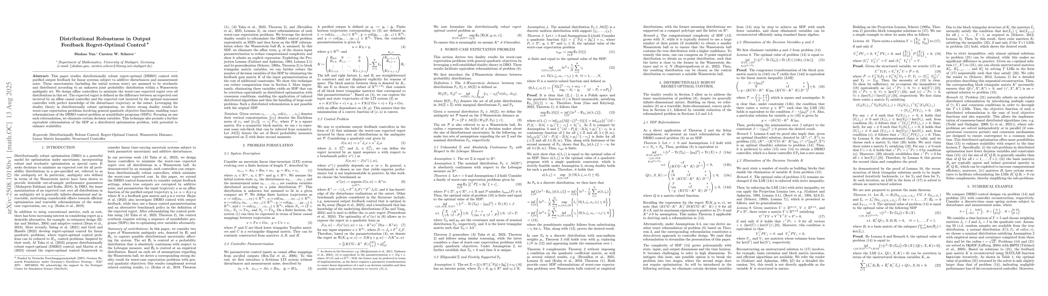 This paper studies distributionally robust regret-optimal (DRRO) control with purified output feedback for linear systems subject to additive disturbances and measurement noise. These uncertainties (including the initial system state) are assumed to be stochastic and distributed according to an unknown joint probability distribution within a Wasserstein ambiguity set. We design affine controllers to minimise the worst-case expected regret over all distributions in this set. The expected regret is defined as the difference between an expected cost incurred by an affine causal controller and the expected cost incurred by the optimal noncausal controller with perfect knowledge of the disturbance trajectory at the outset. Leveraging the duality theory in distributionally robust optimisation, we derive strong duality results for worst-case expectation problems involving general quadratic objective functions, enabling exact reformulations of the DRRO control problem as semidefinite programs (SDPs). Focusing on one such reformulation, we eliminate certain decision variables. This technique also permits a further equivalent reformulation of the SDP as a distributed optimisation problem, with potential to enhance scalability.