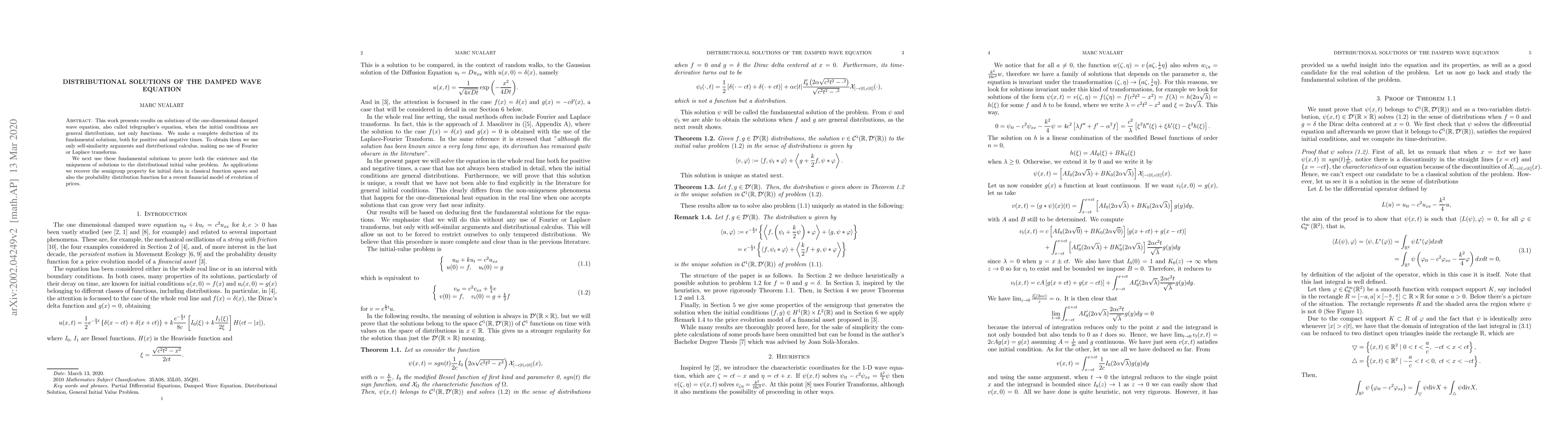 This paper solves the damped wave equation for general initial conditions using self-similarity arguments and distributional calculus, showing existence and uniqueness of solutions and applications in financial models.