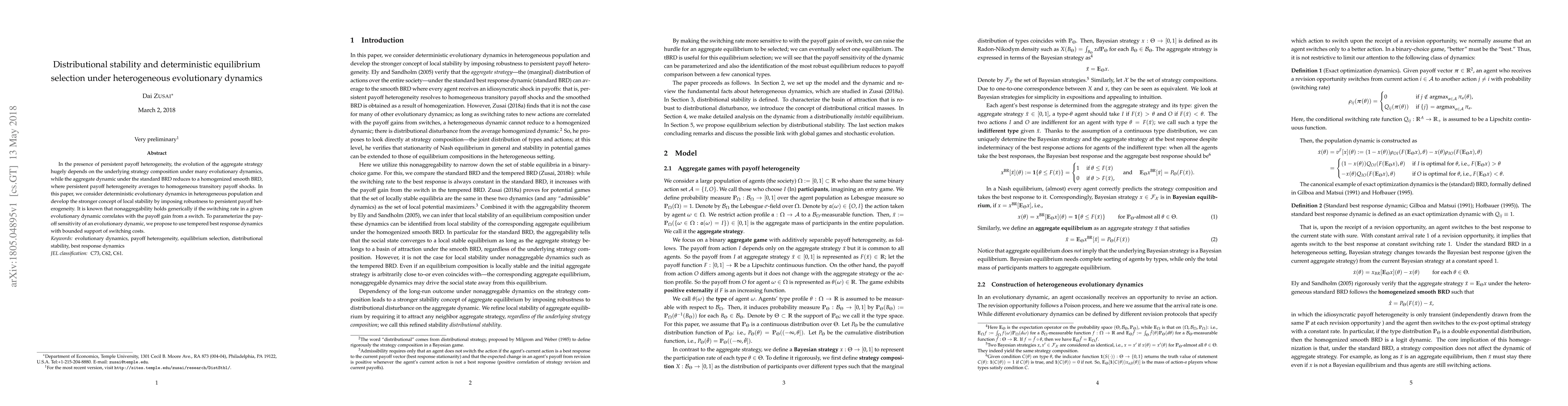 This paper explores how persistent payoff heterogeneity affects the evolution of aggregate strategies in evolutionary dynamics, introducing a new concept for local stability under heterogeneous populations. It proposes tempered best response dynamics to parameterize payoff sensitivity and examine robustness to persistent payoffs.