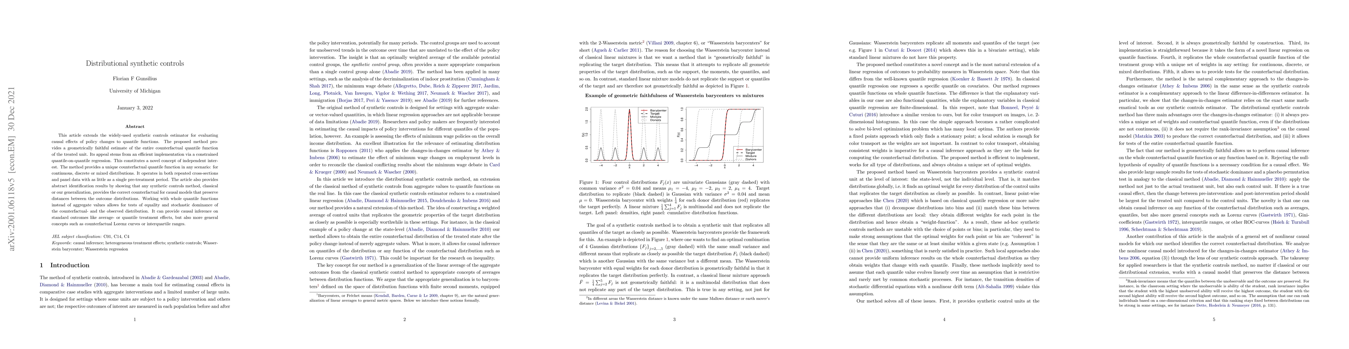 The extension to quantile functions and the use of Wasserstein distances for goodness-of-fit tests distinguish this work from existing synthetic control methods focusing on aggregate outcomes.