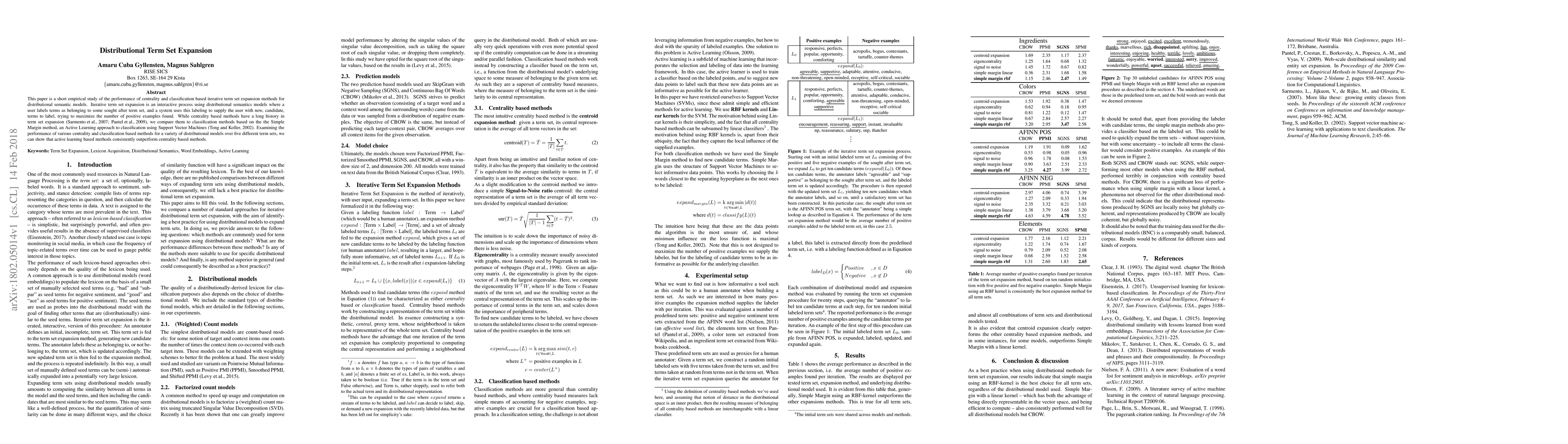 This paper compares centrality and classification-based iterative term set expansion methods for distributional semantic models, finding that active learning approaches using Support Vector Machines outperform traditional centrality methods.