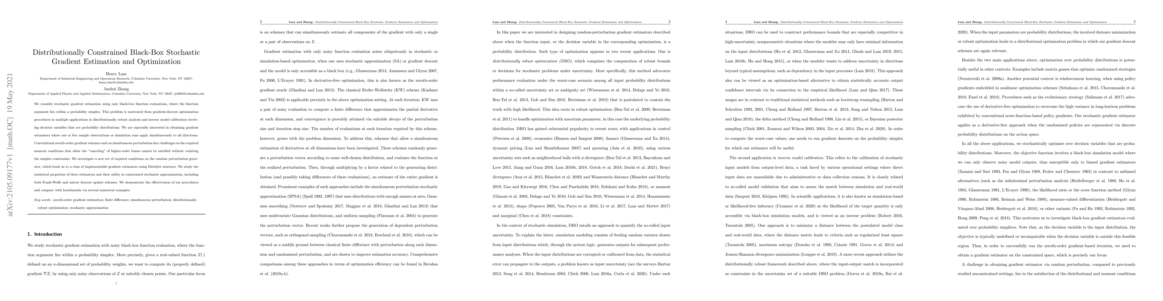 The paper proposes a new set of conditions on the random perturbation generator for distributionally constrained black-box stochastic gradient estimation and optimization, leading to implementable gradient estimators using Dirichlet mixtures. It studies the statistical properties of these estimators and their utility in constrained stochastic approximation, including both Frank-Wolfe and mirror descent update schemes.