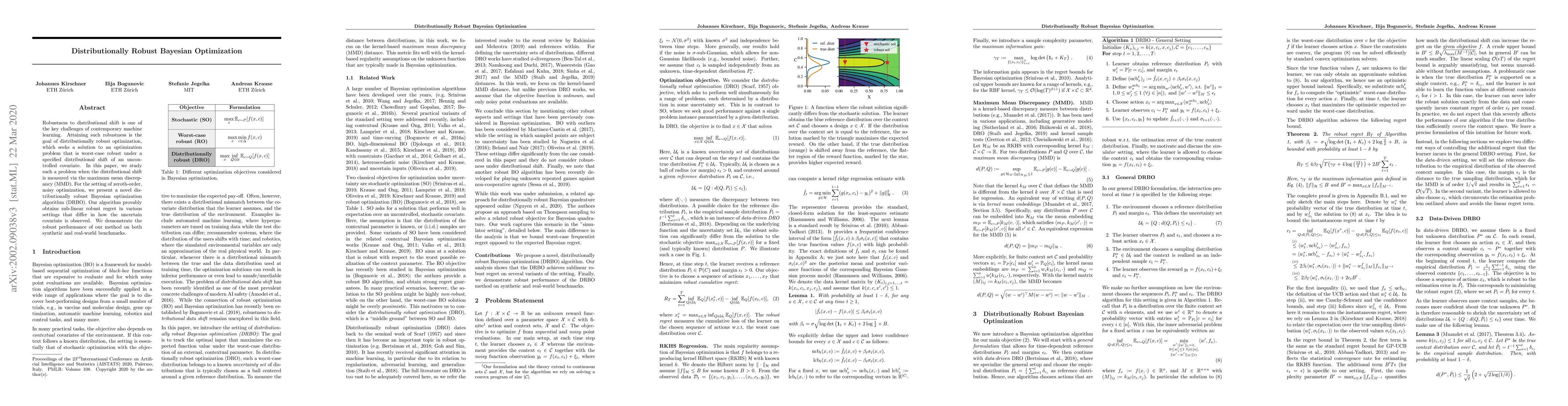 This paper introduces a novel distributionally robust Bayesian optimization algorithm (DRBO) to address robustness to distributional shifts in machine learning. The algorithm achieves sub-linear robust regret under maximum mean discrepancy (MMD) and performs well on both synthetic and real-world datasets.