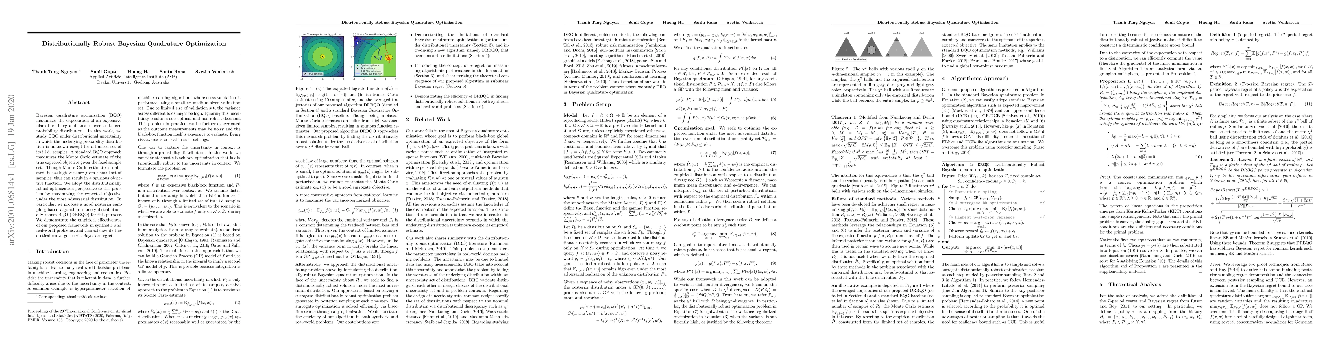 This paper proposes a distributionally robust Bayesian quadrature optimization (DRBQO) framework to address uncertainty in the underlying probability distribution. It aims to maximize the expected objective under the most adversarial distribution, using a novel posterior sampling algorithm, and demonstrates its effectiveness through synthetic and real-world problems, supported by theoretical convergence analysis.