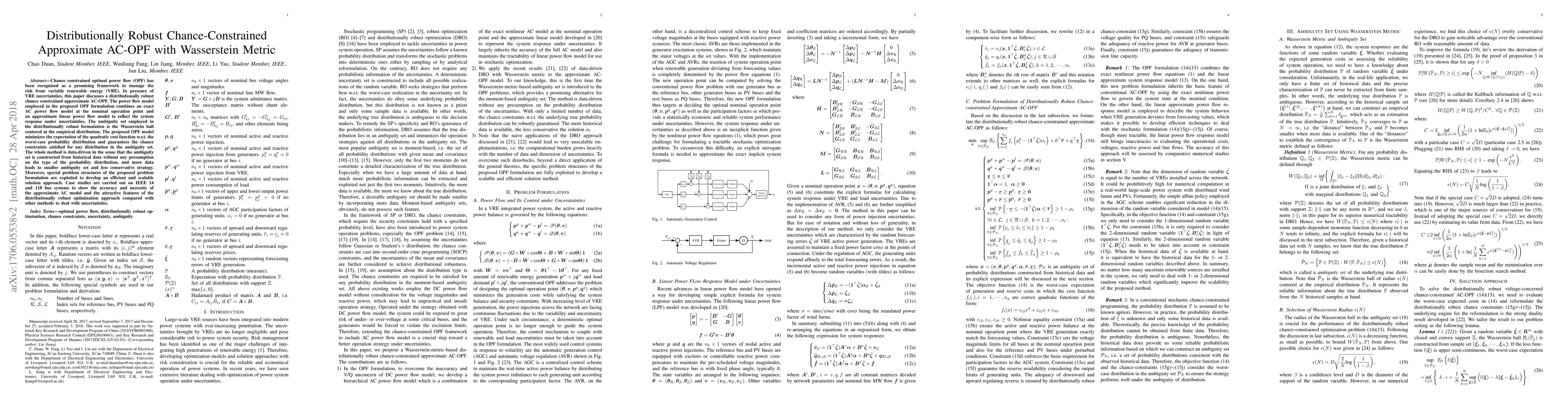 This paper proposes a distributionally robust chance-constrained AC optimal power flow (OPF) model using the Wasserstein metric to manage uncertainties from variable renewable energy. The model combines an exact AC power flow model and an approximate linear model, minimizing the expected quadratic cost while ensuring chance constraints under the worst-case distribution.