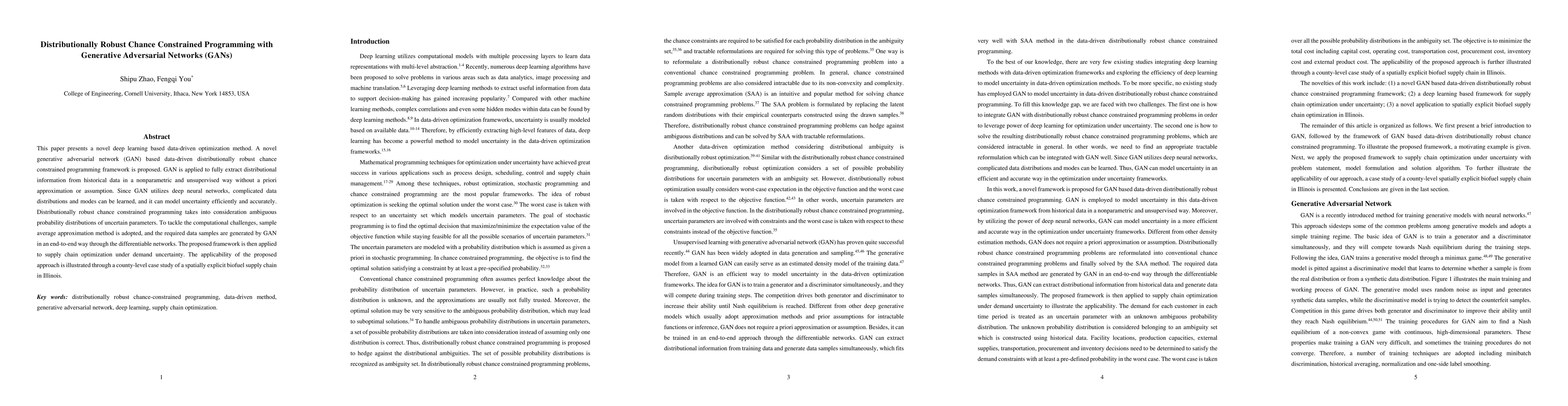This paper proposes a novel GAN-based framework for distributionally robust chance constrained programming, leveraging GANs to extract distributional information from historical data without assumptions. The method is applied to optimize a spatially explicit biofuel supply chain under demand uncertainty, demonstrating its effectiveness through a case study in Illinois.