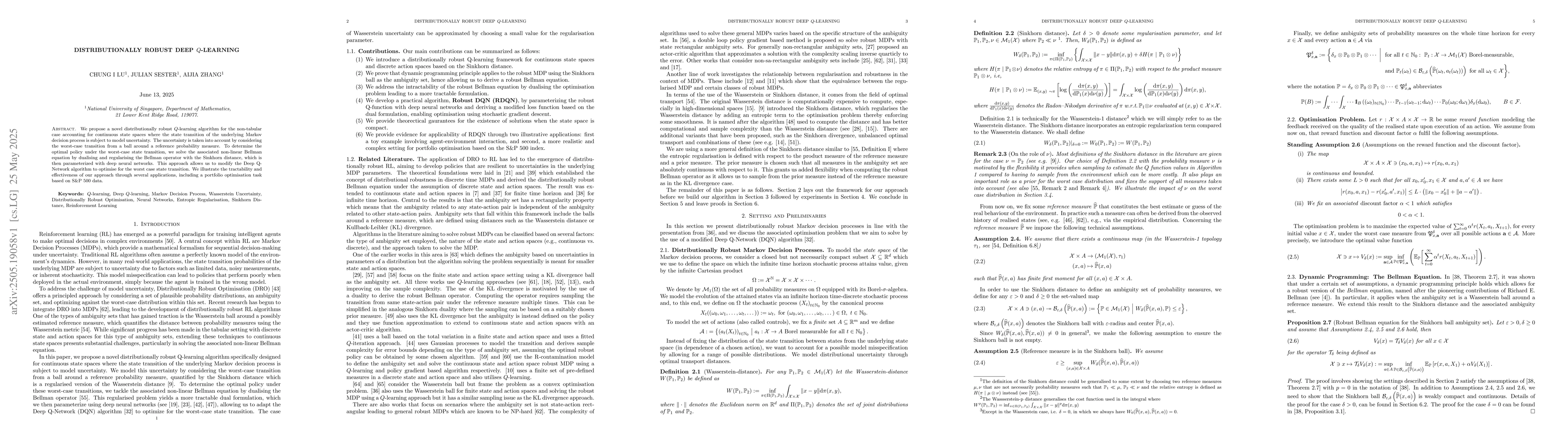 The research proposes a distributionally robust Deep Q-learning algorithm for non-tabular cases with continuous state spaces, addressing model uncertainty in Markov decision processes by considering worst-case transitions from a ball around a reference probability measure. The non-linear Bellman equation is solved using dualization and regularization with the Sinkhorn distance, parameterized by deep neural networks.
