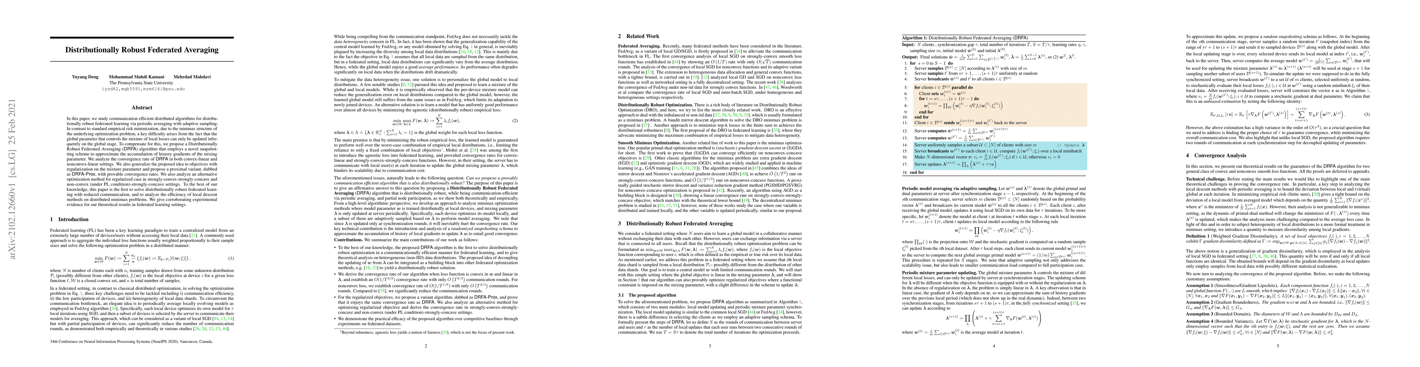 This paper proposes a Distributionally Robust Federated Averaging (DRFA) algorithm to address communication efficiency in federated learning, employing adaptive sampling and a novel snapshotting scheme. It analyzes DRFA's convergence in various settings and introduces a proximal variant, DRFA-Prox, with provable rates, marking the first solution for distributionally robust federated learning with reduced communication.