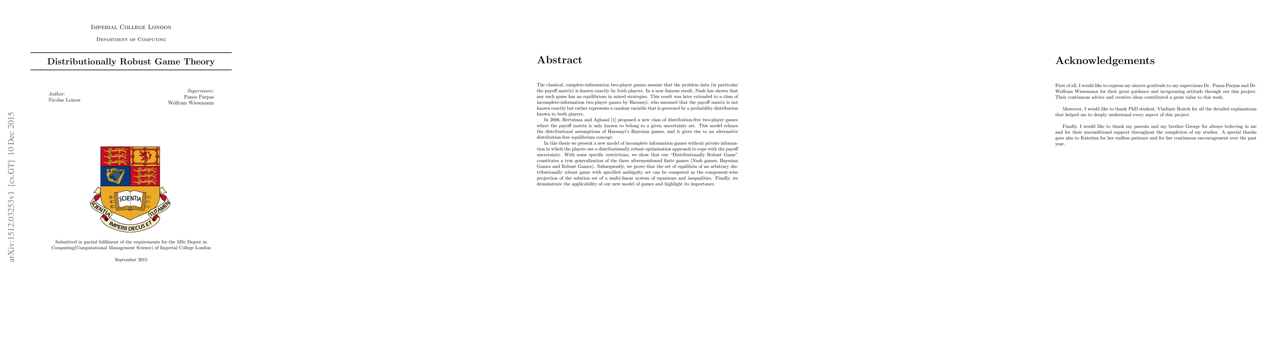 Researchers present a new model of incomplete information games that uses distributionally robust optimization to cope with payoff uncertainty, generalizing Nash games, Bayesian Games, and Robust Games.
