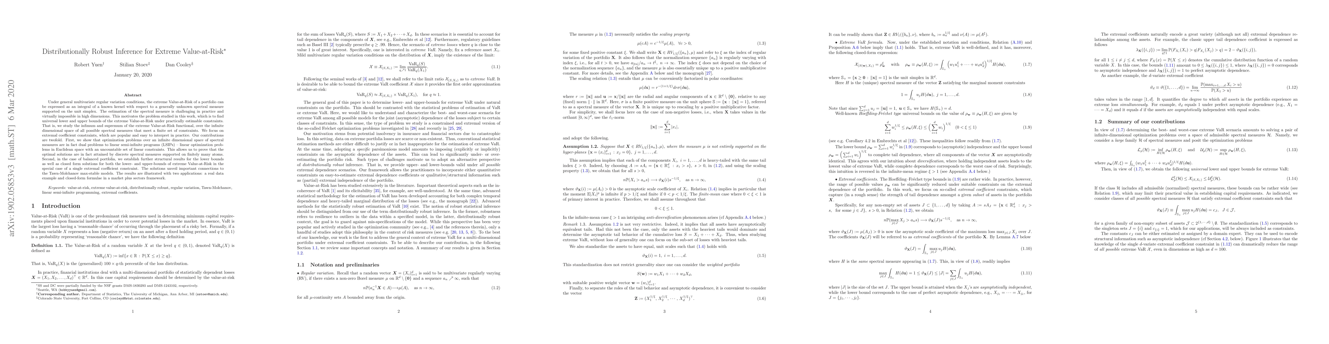 This paper addresses the estimation of extreme Value-at-Risk (VaR) under distributionally robust inference, transforming it into dual linear semi-infinite programs. It demonstrates that optimal solutions are attained by discrete measures, and provides closed-form solutions for balanced portfolios under single extremal coefficient constraints, revealing links to Tawn-Molchanov models.