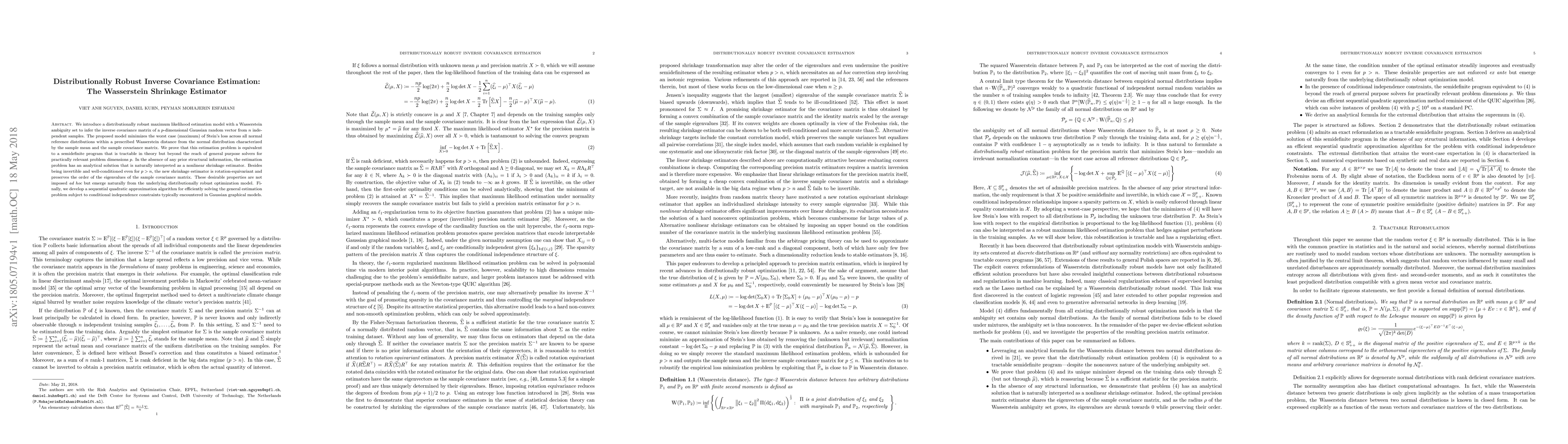 We introduce a distributionally robust maximum likelihood estimation model with a Wasserstein ambiguity set to infer the inverse covariance matrix of a $p$-dimensional Gaussian random vector from $n$ independent samples. The proposed model minimizes the worst case (maximum) of Stein's loss across all normal reference distributions within a prescribed Wasserstein distance from the normal distribution characterized by the sample mean and the sample covariance matrix. We prove that this estimation problem is equivalent to a semidefinite program that is tractable in theory but beyond the reach of general purpose solvers for practically relevant problem dimensions $p$. In the absence of any prior structural information, the estimation problem has an analytical solution that is naturally interpreted as a nonlinear shrinkage estimator. Besides being invertible and well-conditioned even for $p>n$, the new shrinkage estimator is rotation-equivariant and preserves the order of the eigenvalues of the sample covariance matrix. These desirable properties are not imposed ad hoc but emerge naturally from the underlying distributionally robust optimization model. Finally, we develop a sequential quadratic approximation algorithm for efficiently solving the general estimation problem subject to conditional independence constraints typically encountered in Gaussian graphical models.
