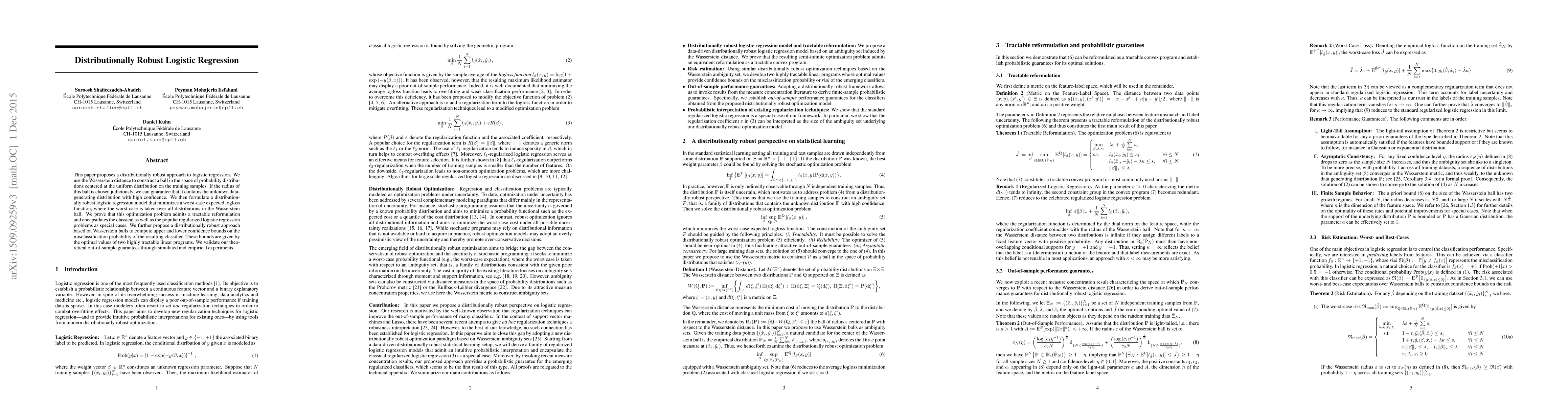 The paper presents a distributionally robust logistic regression model that minimizes a worst-case expected log-loss over a Wasserstein ball centered at the empirical distribution, providing tractable linear program formulations for confidence bounds on misclassification probability.