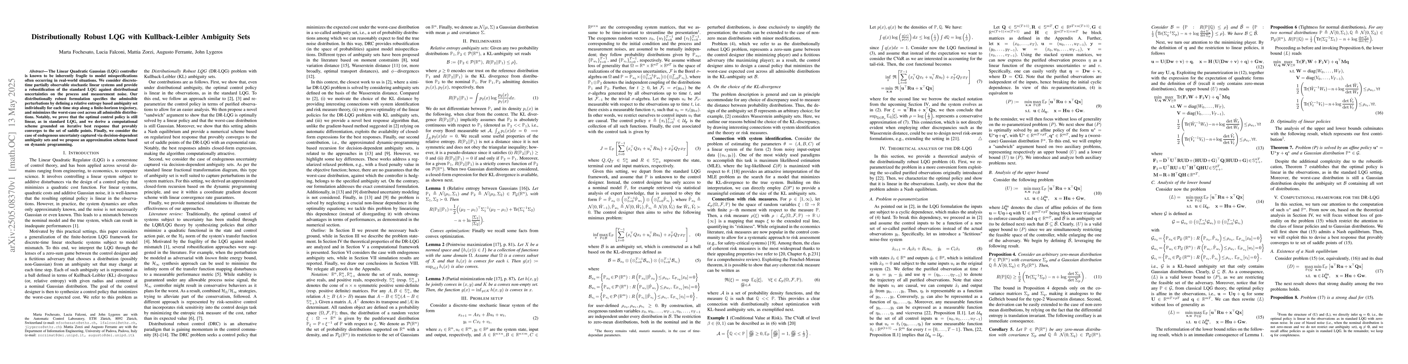The paper presents a distributionally robust LQG formulation using Kullback-Leibler ambiguity sets, proving the linearity of the optimal control policy, and providing a convergent computational scheme via iterative best response.