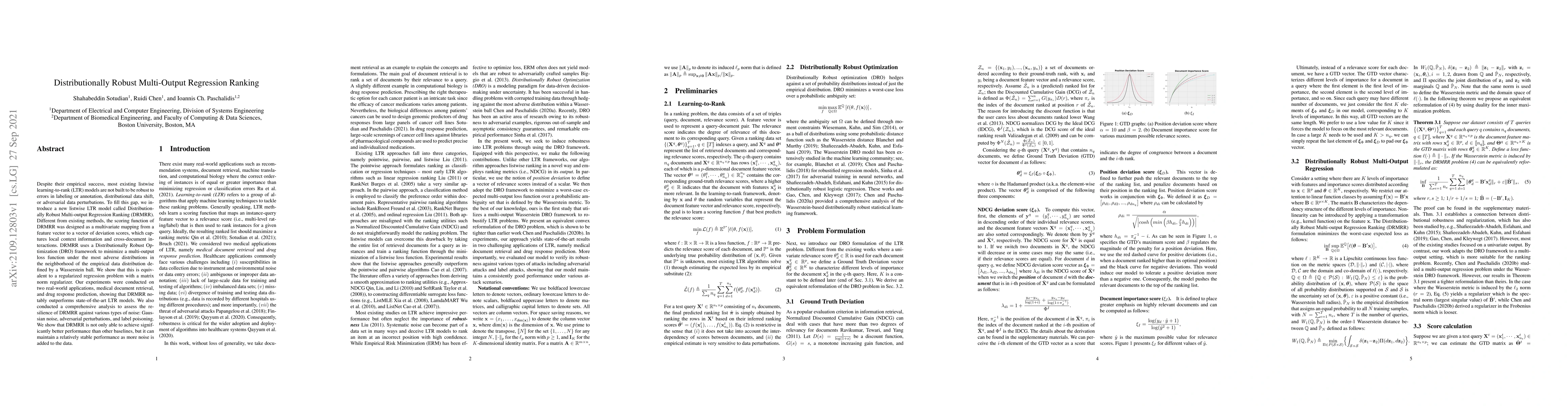 Despite their empirical success, most existing listwiselearning-to-rank (LTR) models are not built to be robust to errors in labeling or annotation, distributional data shift, or adversarial data perturbations. To fill this gap, we introduce a new listwise LTR model called Distributionally Robust Multi-output Regression Ranking (DRMRR). Different from existing methods, the scoring function of DRMRR was designed as a multivariate mapping from a feature vector to a vector of deviation scores, which captures local context information and cross-document interactions. DRMRR uses a Distributionally Robust Optimization (DRO) framework to minimize a multi-output loss function under the most adverse distributions in the neighborhood of the empirical data distribution defined by a Wasserstein ball. We show that this is equivalent to a regularized regression problem with a matrix norm regularizer. Our experiments were conducted on two real-world applications, medical document retrieval, and drug response prediction, showing that DRMRR notably outperforms state-of-the-art LTR models. We also conducted a comprehensive analysis to assess the resilience of DRMRR against various types of noise: Gaussian noise, adversarial perturbations, and label poisoning. We show that DRMRR is not only able to achieve significantly better performance than other baselines, but it can maintain a relatively stable performance as more noise is added to the data.