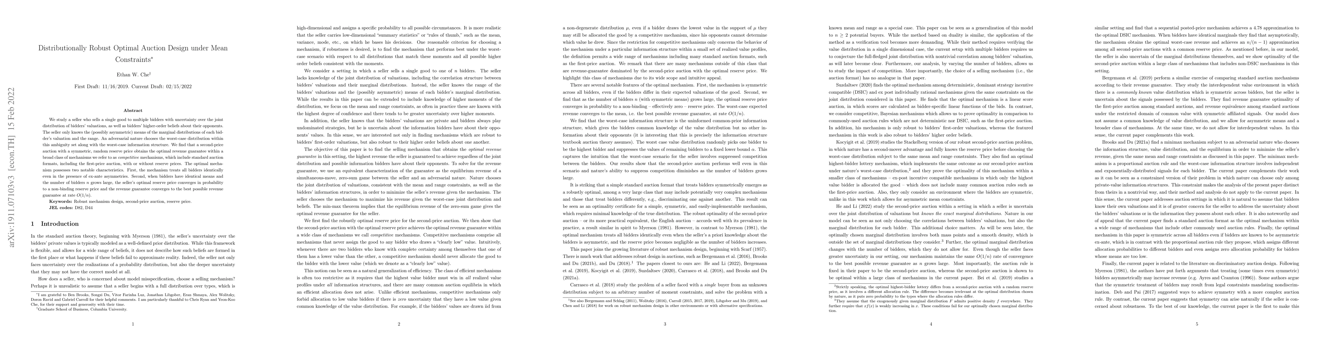 We study a seller who sells a single good to multiple bidders with uncertainty over the joint distribution of bidders' valuations, as well as bidders' higher-order beliefs about their opponents. The seller only knows the (possibly asymmetric) means of the marginal distributions of each bidder's valuation and the range. An adversarial nature chooses the worst-case distribution within this ambiguity set along with the worst-case information structure. We find that a second-price auction with a symmetric, random reserve price obtains the optimal revenue guarantee within a broad class of mechanisms we refer to as competitive mechanisms, which include standard auction formats, including the first-price auction, with or without reserve prices. The optimal mechanism possesses two notable characteristics. First, the mechanism treats all bidders identically even in the presence of ex-ante asymmetries. Second, when bidders are identical and the number of bidders $n$ grows large, the seller's optimal reserve price converges in probability to a non-binding reserve price and the revenue guarantee converges to the best possible revenue guarantee at rate $O(1/n)$.