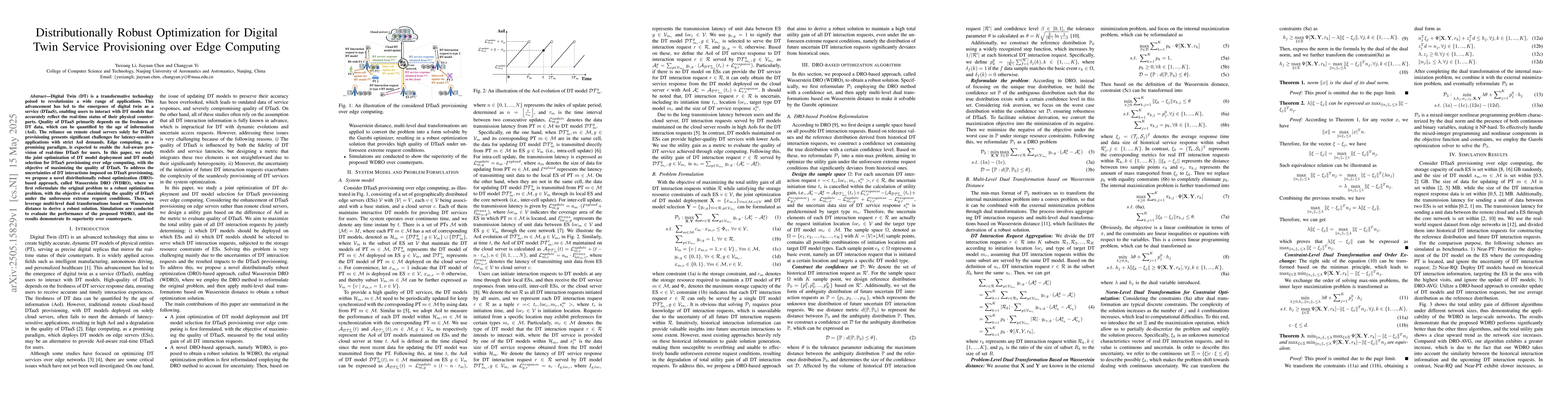 This paper proposes a distributionally robust optimization approach to improve the quality of digital twin services provided over edge computing, ensuring real-time freshness of data for latency-sensitive applications.