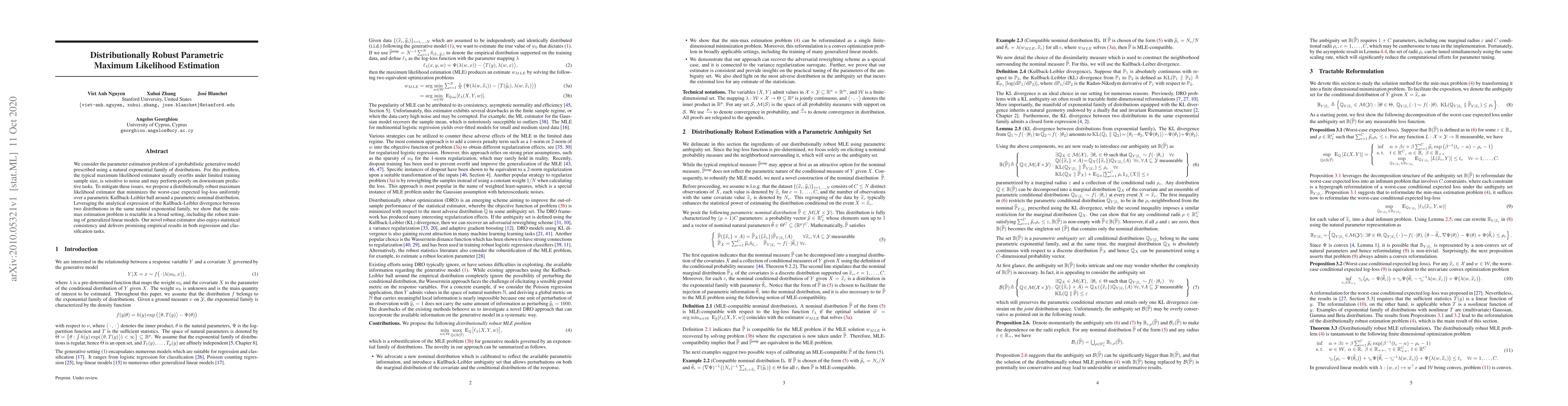 This paper proposes a distributionally robust maximum likelihood estimator to address overfitting and noise sensitivity in probabilistic generative models. The robust estimator minimizes the worst-case expected log-loss within a parametric Kullback-Leibler ball, ensuring statistical consistency and delivering promising results in regression and classification tasks.