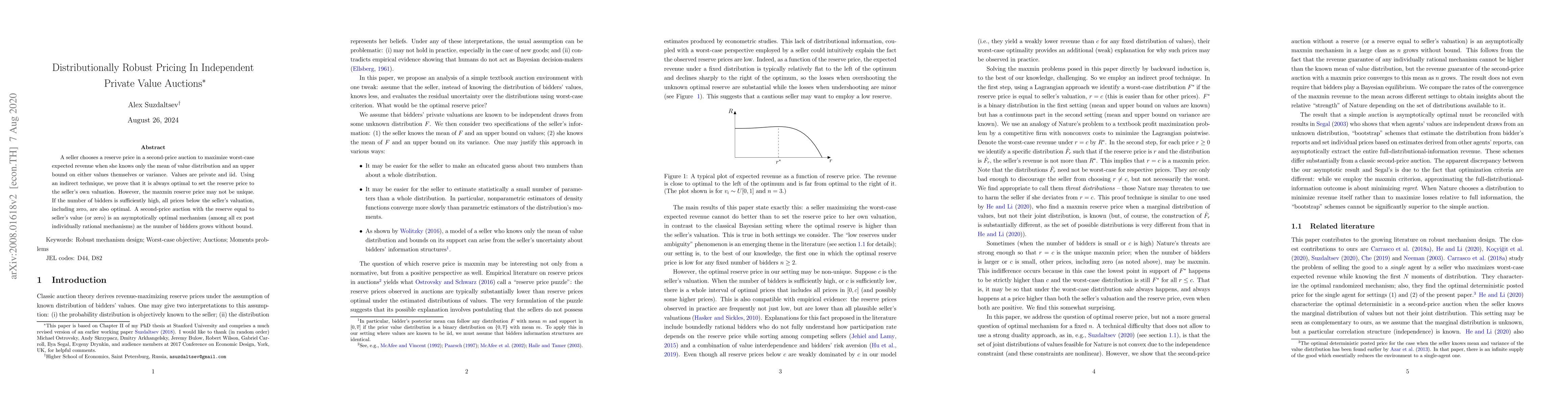 A seller chooses a reserve price in a second-price auction to maximize worst-case expected revenue when she knows only the mean of value distribution and an upper bound on either values themselves or variance. Values are private and iid. Using an indirect technique, we prove that it is always optimal to set the reserve price to the seller's own valuation. However, the maxmin reserve price may not be unique. If the number of bidders is sufficiently high, all prices below the seller's valuation, including zero, are also optimal. A second-price auction with the reserve equal to seller's value (or zero) is an asymptotically optimal mechanism (among all ex post individually rational mechanisms) as the number of bidders grows without bound.
