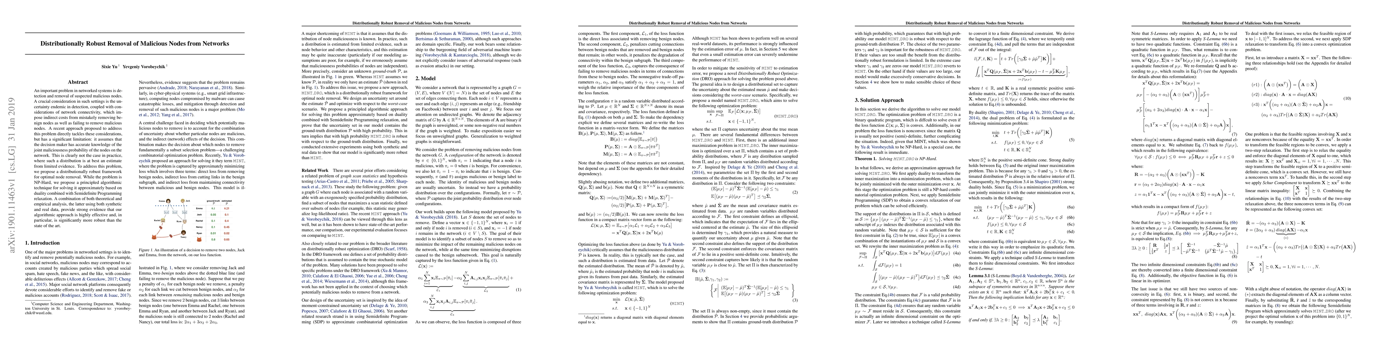 An important problem in networked systems is detection and removal of suspected malicious nodes. A crucial consideration in such settings is the uncertainty endemic in detection, coupled with considerations of network connectivity, which impose indirect costs from mistakely removing benign nodes as well as failing to remove malicious nodes. A recent approach proposed to address this problem directly tackles these considerations, but has a significant limitation: it assumes that the decision maker has accurate knowledge of the joint maliciousness probability of the nodes on the network. This is clearly not the case in practice, where such a distribution is at best an estimate from limited evidence. To address this problem, we propose a distributionally robust framework for optimal node removal. While the problem is NP-Hard, we propose a principled algorithmic technique for solving it approximately based on duality combined with Semidefinite Programming relaxation. A combination of both theoretical and empirical analysis, the latter using both synthetic and real data, provide strong evidence that our algorithmic approach is highly effective and, in particular, is significantly more robust than the state of the art.