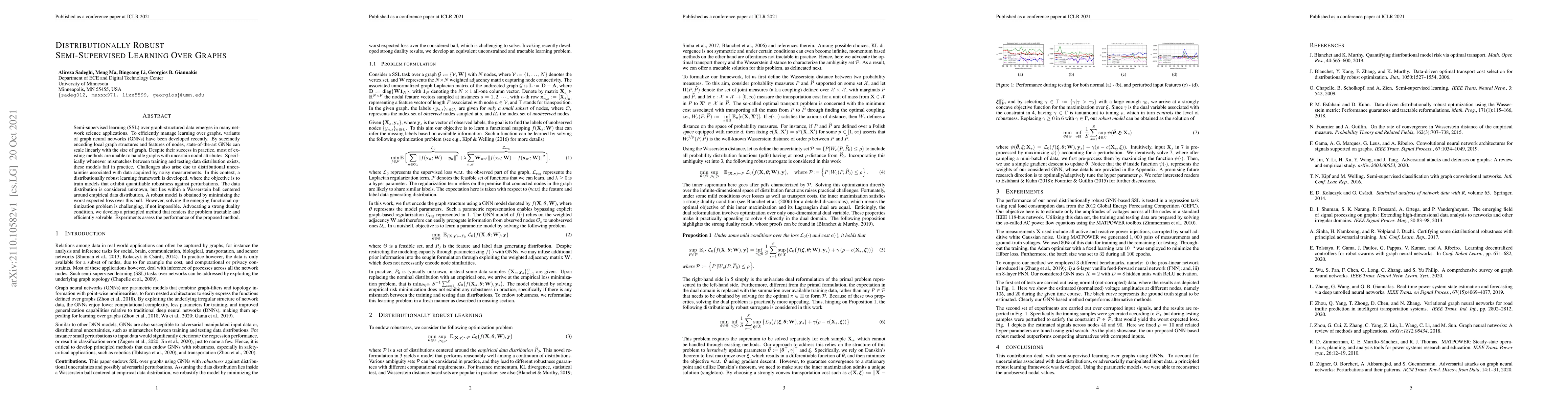 This paper proposes a distributionally robust learning framework for semi-supervised learning over graph-structured data, addressing challenges due to uncertainties in nodal attributes and noisy measurements. The method efficiently solves the challenging optimization problem via a strong duality condition, demonstrating robust performance in experiments.
