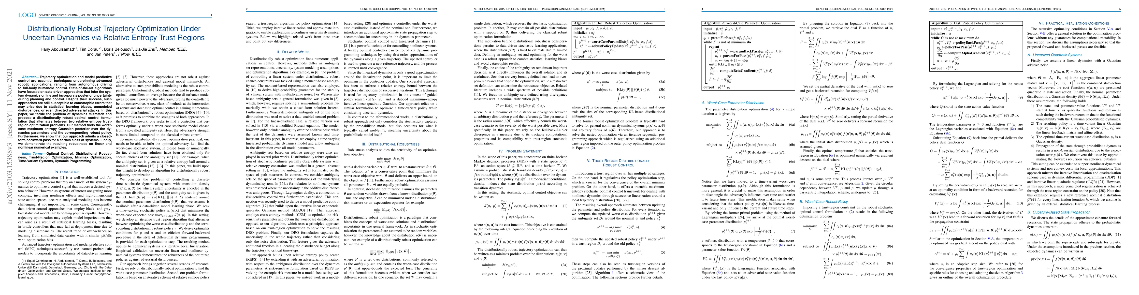 Trajectory optimization and model predictive control are essential techniques underpinning advanced robotic applications, ranging from autonomous driving to full-body humanoid control. State-of-the-art algorithms have focused on data-driven approaches that infer the system dynamics online and incorporate posterior uncertainty during planning and control. Despite their success, such approaches are still susceptible to catastrophic errors that may arise due to statistical learning biases, unmodeled disturbances, or even directed adversarial attacks. In this paper, we tackle the problem of dynamics mismatch and propose a distributionally robust optimal control formulation that alternates between two relative entropy trust-region optimization problems. Our method finds the worst-case maximum entropy Gaussian posterior over the dynamics parameters and the corresponding robust policy. Furthermore, we show that our approach admits a closed-form backward-pass for a certain class of systems. Finally, we demonstrate the resulting robustness on linear and nonlinear numerical examples.