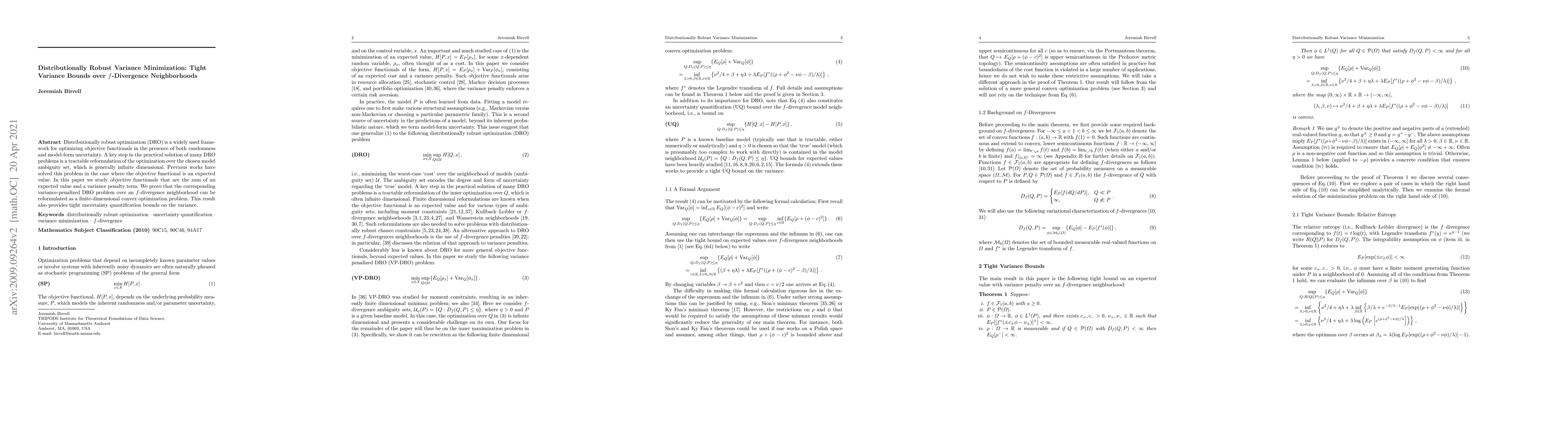 This paper reformulates distributionally robust variance minimization problems with an $f$-divergence neighborhood into a finite-dimensional convex optimization problem, providing tight variance bounds and practical solutions for uncertainty quantification.