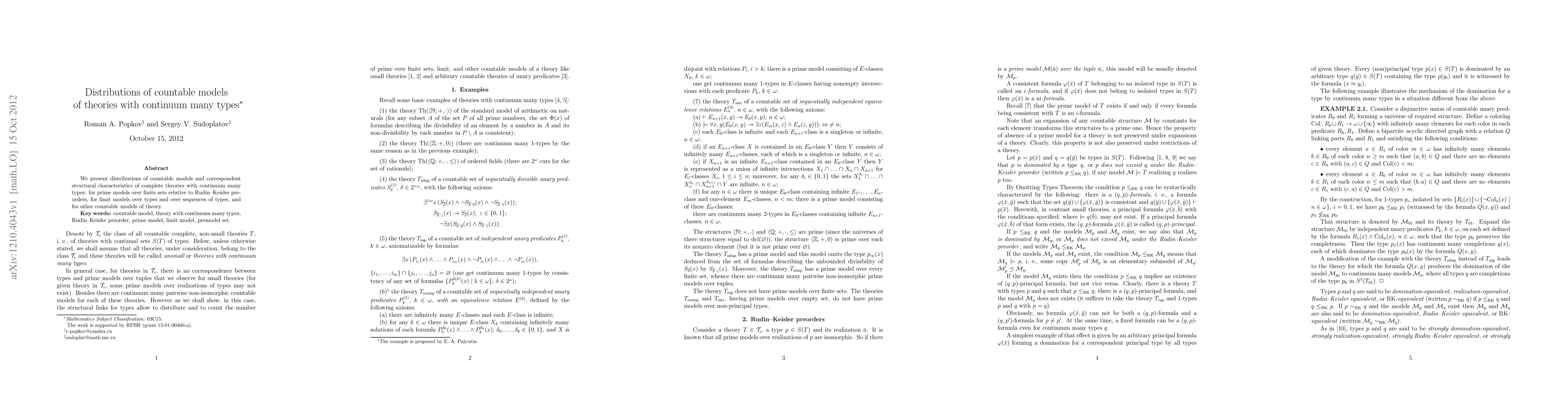 This paper investigates the distributions and structural characteristics of countable models for theories with continuum many types, focusing on prime models, limit models, and other relevant countable models within the context of Rudin-Keisler preorders.